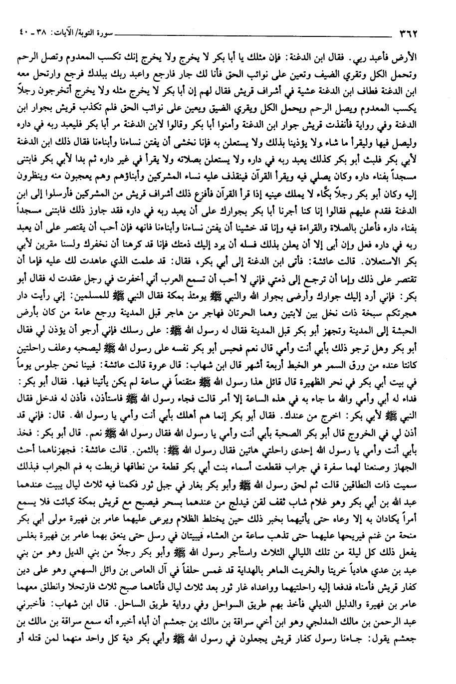 الأرض فأعبد ربي. فقال ابن الدغنة: فإن مثلك يا أبا بكر لا يخرج ولا يخرج إنك تكسب المعدوم وتصل الرحم وتحمل الكل وتقري الضيف وتعين على نوائب الحق فأنا لك جار فارجع واعبد ربك ببلدك فرجع وارتحل معه ابن الدغنة فطاف ابن الدغنة عشية في أشراف قريش فقال لهم إن أبا بكر لا يخرج مثله ولا يخرج أتخرجون رجلا يكسب المعدوم ويصل الرحم ويحمل الكل ويقري الضيق ويعين على نوائب الحق فلم تكذب قريش بجوار ابن الدغنة وفي رواية فأنفذت قريش جوار ابن الدغنة وأمنوا أبا بكر وقالوا لابن الدغنة مر أبا بكر فليعبد ربه في داره وليصل فيها وليقرأ ما شاء ولا يؤذينا بذلك ولا يستعلن به فإنا نخشى أن يفتن نساءنا وأبناءنا فقال ذلك ابن الدغنة لأبي بكر فلبث أبو بكر كذلك يعبد ربه في داره ولا يستعلن بصلاته ولا يقرأ في غير داره ثم بدا لأبي بكر فابتنى مسجدا بفناء داره وكان يصلي فيه ويقرأ القرآن فينقذ عليه نساء المشركين وأبناؤهم وهم يعجبون منه وينظرون إليه وكان أبو بكر رجلا بكّاء لا يملك عينيه إذا قرأ القرآن فأفزع ذلك أشراف قريش من المشركين فأرسلوا إلى ابن الدغنة فقدم عليهم فقالوا إنا كنا أجرنا أبا بكر بجوارك على أن يعبد ربه في داره فقد جاوز ذلك فابتنى مسجدا بفناء داره فأعلن بالصلاة والقراءة فيه وإنا قد خشينا أن يفتن نساءنا وأبناءنا فانهه فإن أحب أن يقتصر على أن يعبد ربه في داره فعل وإن أبى إلا أن يعلن بذلك فسله أن يرد إليك ذمتك فإنا قد كرهنا أن نخفرك ولسنا مقرين لأبي بكر الاستعلان. قالت عائشة: فأتى ابن الدغنة إلى أبي بكر، فقال: قد علمت الذي عاهدت لك عليه فإما أن تقتصر على ذلك وإما أن ترجع إلى ذمتي فإني لا أحب أن تسمع العرب أني أخفرت في رجل عقدت له فقال أبو بكر: فإني أراد إليك جوارك وأرضى بجوار الله والنبي صلى الله عليه وسلم يومئذ بمكة فقال النبي صلى الله عليه وسلم للمسلمين: إني رأيت دار هجرتكم سبخة ذات نخل بين لابتين وهما الحرتان فهاجر من هاجر قبل المدينة ورجع عامة من كان بأرض الحبشة إلى المدينة وتجهز أبو بكر قبل المدينة فقال له رسول الله صلى الله عليه وسلم: على رسلك فإني أرجو أن يؤذن لي فقال أبو بكر وهل ترجو ذلك بأبي أنت وأمي قال نعم فحبس أبو بكر نفسه على رسول الله صلى الله عليه وسلم ليصحبه وعلف راحلتين كانتا عنده من ورق السمر هو الخبط أربعة أشهر قال ابن شهاب: قال عروة قالت عائشة: فبينا نحن جلوس يوما في بيت أبي بكر في نحر الظهيرة قال قائل هذا رسول الله صلى الله عليه وسلم متقنعا في ساعة لم يكن يأتينا فيها. فقال أبو بكر: