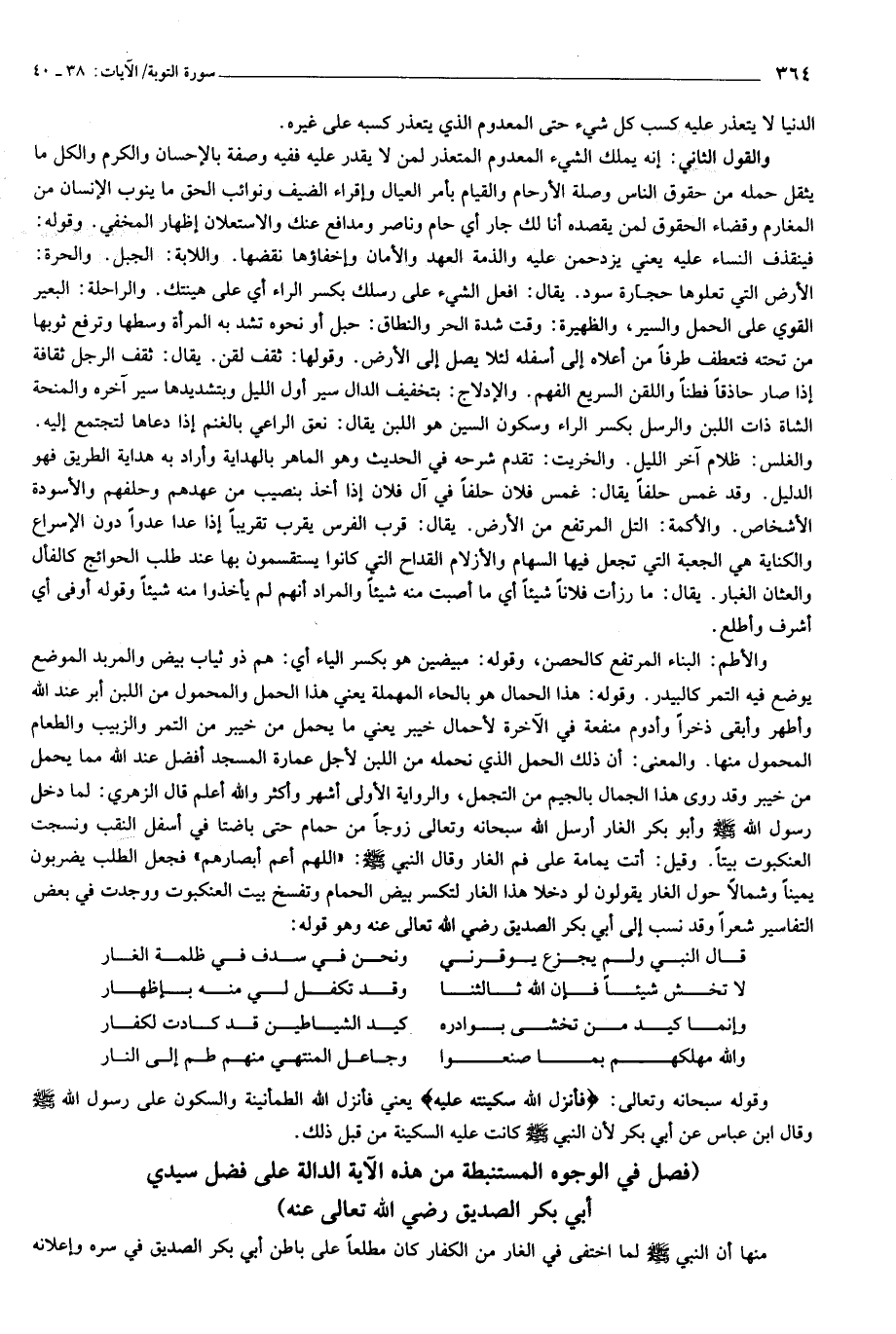 ((فصل في الوجوه المستنبطة من هذه الآية الدالة على فضل سيدي أبي بكر الصديق رضي الله تعالى عنه)) منها أن النبي صلى الله عليه وسلم لما اختفى في الغار من الكفار كان مطلعا على باطن أبي بكر الصديق في سره وإعلانه