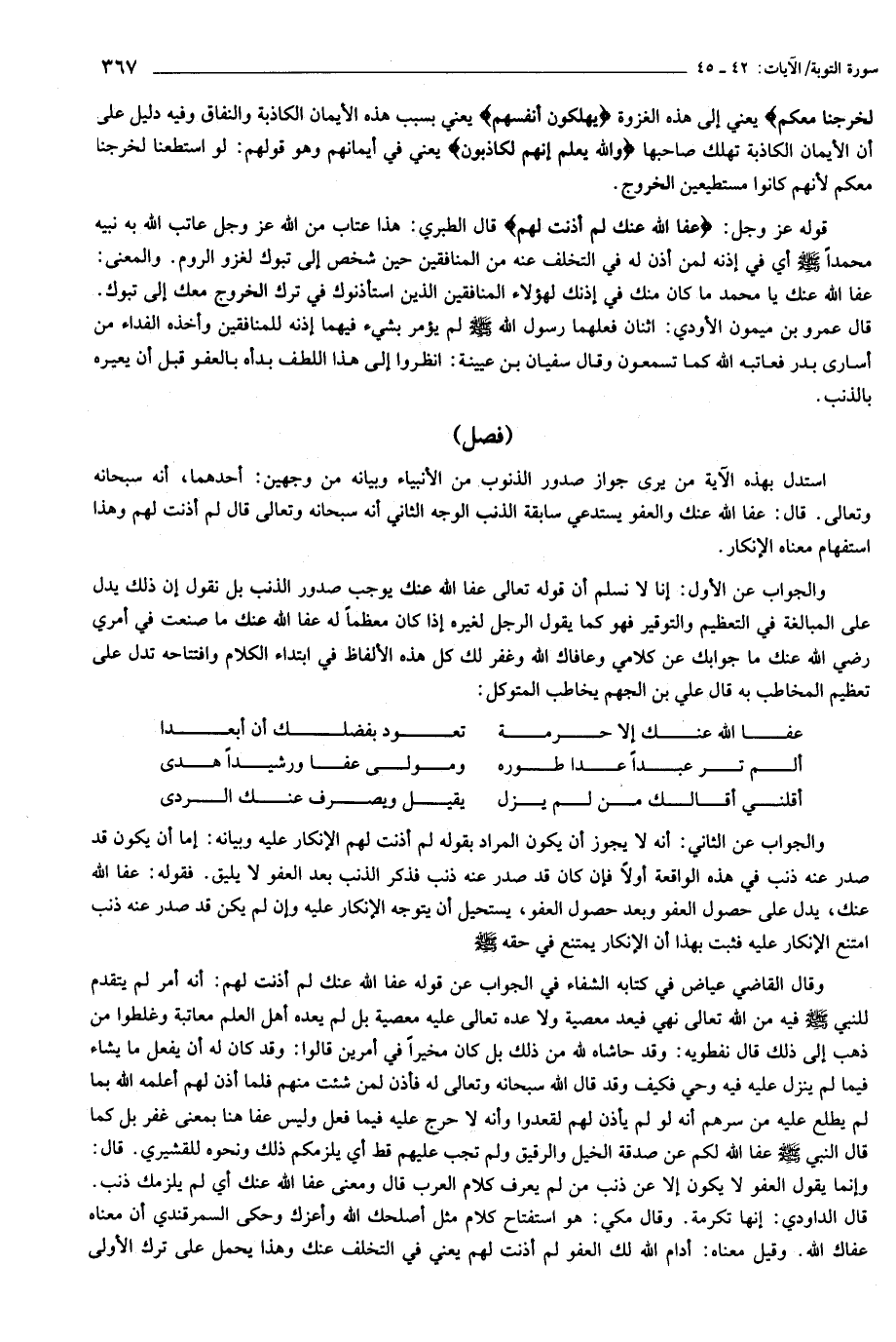 والجواب عن الثاني: أنه لا يجوز أن يكون المراد بقوله لم أذنت لهم الإنكار عليه وبيانه: إما أن يكون قد صدر عنه ذنب في هذه الواقعة أولا فإن كان قد صدر عنه ذنب فذكر الذنب بعد العفو لا يليق. فقوله: عفا الله عنك، يدل على حصول العفو وبعد حصول العفو، يستحيل أن يتوجه الإنكار عليه وإن لم يكن قد صدر عنه ذنب امتنع الإنكار عليه فثبت بهذا أن الإنكار يمتنع في حقه صلى الله عليه وسلم وقال القاضي عياض في كتابه الشفاء في الجواب عن قوله عفا الله عنك لم أذنت لهم: أنه أمر لم يتقدم للنبي صلى الله عليه وسلم فيه من الله تعالى نهي فيعد معصية ولا عده تعالى عليه معصية بل لم يعده أهل العلم معاتبة وغلطوا من ذهب إلى ذلك قال نفطويه: وقد حاشاه لله من ذلك بل كان مخيرا في أمرين قالوا: وقد كان له أن يفعل ما يشاء فيما لم ينزل عليه فيه وحي فكيف وقد قال الله سبحانه وتعالى له فأذن لمن شئت منهم فلما أذن لهم أعلمه الله بما لم يطلع عليه من سرهم أنه لو لم يأذن لهم لقعدوا وأنه لا حرج عليه فيما فعل وليس عفا هنا بمعنى غفر بل كما قال النبي صلى الله عليه وسلم عفا الله لكم عن صدقة الخيل والرقيق ولم تجب عليهم قط أي يلزمكم ذلك ونحوه للقشيري. قال: