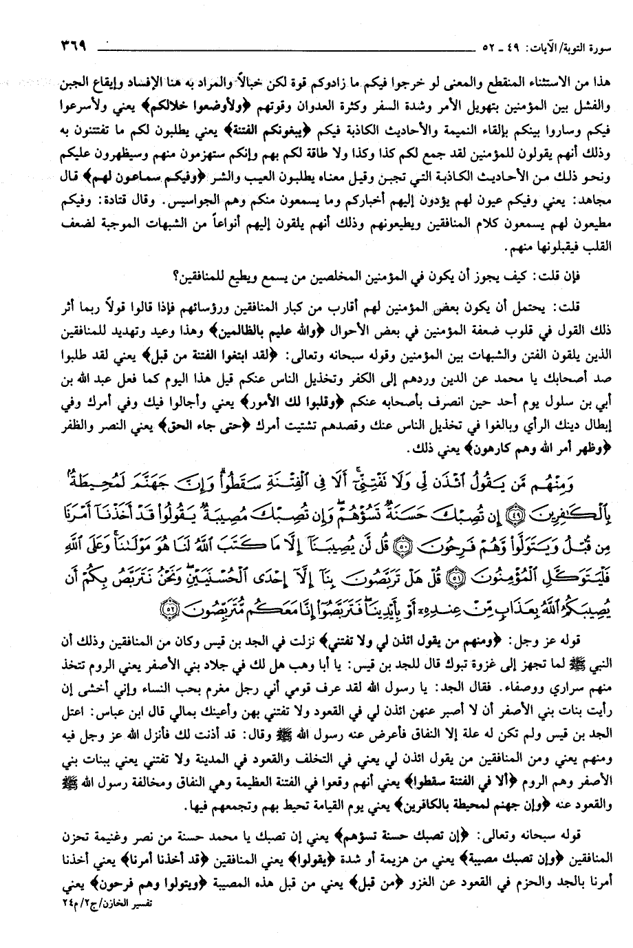 وَمِنْهُمْ مَنْ يَقُولُ ائْذَنْ لِي وَلا تَفْتِنِّي أَلا فِي الْفِتْنَةِ سَقَطُوا وَإِنَّ جَهَنَّمَ لَمُحِيطَةٌ بِالْكافِرِينَ (49) إِنْ تُصِبْكَ حَسَنَةٌ تَسُؤْهُمْ وَإِنْ تُصِبْكَ مُصِيبَةٌ يَقُولُوا قَدْ أَخَذْنا أَمْرَنا مِنْ قَبْلُ وَيَتَوَلَّوْا وَهُمْ فَرِحُونَ (50) قُلْ لَنْ يُصِيبَنا إِلاَّ ما كَتَبَ اللَّهُ لَنا هُوَ مَوْلانا وَعَلَى اللَّهِ فَلْيَتَوَكَّلِ الْمُؤْمِنُونَ (51) قُلْ هَلْ تَرَبَّصُونَ بِنا إِلاَّ إِحْدَى الْحُسْنَيَيْنِ وَنَحْنُ نَتَرَبَّصُ بِكُمْ أَنْ يُصِيبَكُمُ اللَّهُ بِعَذابٍ مِنْ عِنْدِهِ أَوْ بِأَيْدِينا فَتَرَبَّصُوا إِنَّا مَعَكُمْ مُتَرَبِّصُونَ (52)