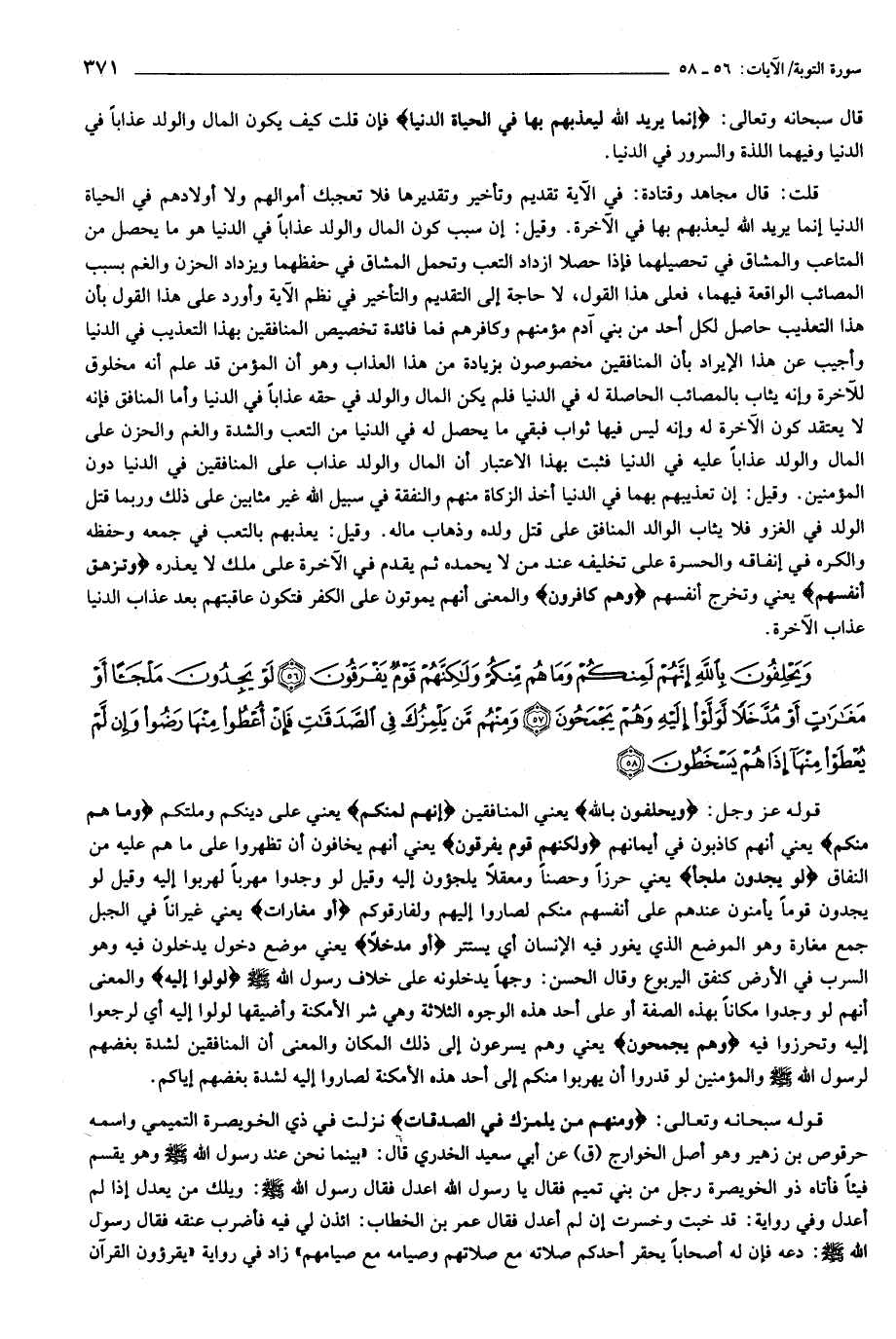 وَيَحْلِفُونَ بِاللَّهِ إِنَّهُمْ لَمِنْكُمْ وَما هُمْ مِنْكُمْ وَلكِنَّهُمْ قَوْمٌ يَفْرَقُونَ (56) لَوْ يَجِدُونَ مَلْجَأً أَوْ مَغاراتٍ أَوْ مُدَّخَلاً لَوَلَّوْا إِلَيْهِ وَهُمْ يَجْمَحُونَ (57) وَمِنْهُمْ مَنْ يَلْمِزُكَ فِي الصَّدَقاتِ فَإِنْ أُعْطُوا مِنْها رَضُوا وَإِنْ لَمْ يُعْطَوْا مِنْها إِذا هُمْ يَسْخَطُونَ (58)
