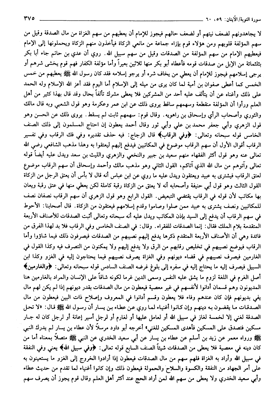 لا يجاهدونهم لضعف نيتهم أو لضعف حالهم فيجوز للإمام أن يعطيهم من سهم الغزاة من مال الصدقة وقيل من سهم المؤلفة قلوبهم ومن هؤلاء قوم بإزاء جماعة من مانعي الزكاة فيأخذون منهم الزكاة ويحملونها إلى الإمام فيعطيهم الإمام من سهم المؤلفة من الصدقات وقيل من سهم سبيل الله. روي أن عدي بن حاتم جاء أبا بكر بثلاثمائة من الإبل من صدقات قومه فأعطاه أبو بكر منها ثلاثين بعيرا وأما مؤلفة الكفار فهم قوم يخشى شرهم أو يرجى إسلامهم فيجوز للإمام أن يعطي من يخاف شره أو يرجو إسلامه فقد كان رسول الله صلى الله عليه وسلم يعطيهم من خمس الخمس كما أعطى صفوان بن أمية لما كان يرى من ميله إلى الإسلام أما اليوم فقد أعز الله الإسلام وله الحمد على ذلك وأغناه عن أن يتألف عليه أحد من المشركين فلا يعطى مشرك تألفا بحال وقد قال بهذا كثير من أهل العلم ورأوا أن المؤلفة منقطعة وسهمهم ساقط يروى ذلك عن ابن عمر وعكرمة وهو قول الشعبي وبه قال مالك والثوري وأصحاب الرأي وإسحاق بن راهويه. وقال قوم: سهمهم ثابت لم يسقط. يروى ذلك عن الحسن وهو قول الزهري وأبي جعفر محمد بن علي وأبي ثور وقال أحمد يعطون إن احتاج المسلمون إلى ذلك الصنف الخامس قوله سبحانه وتعالى: وَفِي الرِّقابِ قال الزجاج: فيه حذف تقديره وفي فك الرقاب وفي تفسير الرقاب أقوال الأول أن سهم الرقاب موضوع في المكاتبين فيدفع إليهم ليعتقوا به وهذا مذهب الشافعي رضي الله تعالى عنه وهو قول أكثر الفقهاء منهم سعيد بن جبير والنخعي والزهري والليث بن سعد ويدل عليه أيضا قوله تعالى وآتوهم من مال الله الذي آتاكم، القول الثاني وهو مذهب مالك وأحمد وإسحاق أن سهم