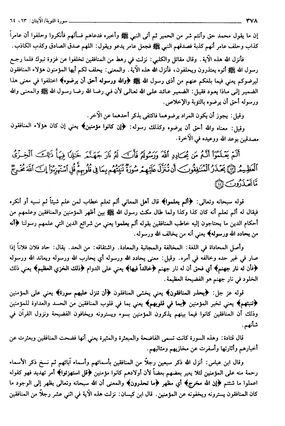 أَلَمْ يَعْلَمُوا أَنَّهُ مَنْ يُحادِدِ اللَّهَ وَرَسُولَهُ فَأَنَّ لَهُ نارَ جَهَنَّمَ خالِداً فِيها ذلِكَ الْخِزْيُ الْعَظِيمُ (63) يَحْذَرُ الْمُنافِقُونَ أَنْ تُنَزَّلَ عَلَيْهِمْ سُورَةٌ تُنَبِّئُهُمْ بِما فِي قُلُوبِهِمْ قُلِ اسْتَهْزِؤُا إِنَّ اللَّهَ مُخْرِجٌ ما تَحْذَرُونَ (64)