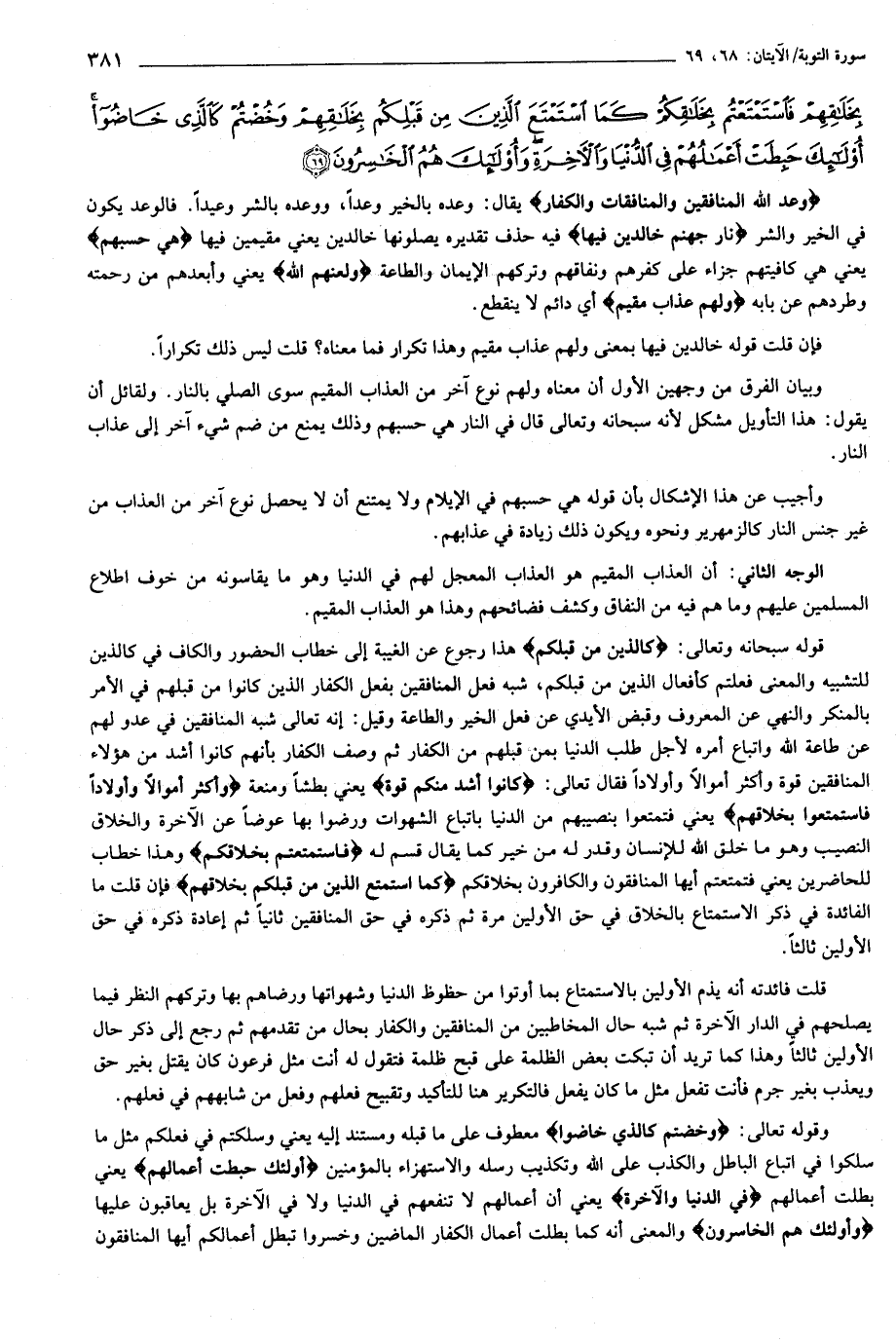 وَعَدَ اللَّهُ الْمُنافِقِينَ وَالْمُنافِقاتِ وَالْكُفَّارَ نارَ جَهَنَّمَ خالِدِينَ فِيها هِيَ حَسْبُهُمْ وَلَعَنَهُمُ اللَّهُ وَلَهُمْ عَذابٌ مُقِيمٌ (68) كَالَّذِينَ مِنْ قَبْلِكُمْ كانُوا أَشَدَّ مِنْكُمْ قُوَّةً وَأَكْثَرَ أَمْوالاً وَأَوْلاداً فَاسْتَمْتَعُوا بِخَلاقِهِمْ فَاسْتَمْتَعْتُمْ بِخَلاقِكُمْ كَمَا اسْتَمْتَعَ الَّذِينَ مِنْ قَبْلِكُمْ بِخَلاقِهِمْ وَخُضْتُمْ كَالَّذِي خاضُوا أُولئِكَ حَبِطَتْ أَعْمالُهُمْ فِي الدُّنْيا وَالْآخِرَةِ وَأُولئِكَ هُمُ الْخاسِرُونَ (69)