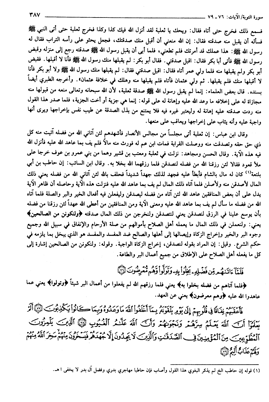 فَأَعْقَبَهُمْ نِفاقاً فِي قُلُوبِهِمْ إِلى يَوْمِ يَلْقَوْنَهُ بِما أَخْلَفُوا اللَّهَ ما وَعَدُوهُ وَبِما كانُوا يَكْذِبُونَ (77) أَلَمْ يَعْلَمُوا أَنَّ اللَّهَ يَعْلَمُ سِرَّهُمْ وَنَجْواهُمْ وَأَنَّ اللَّهَ عَلاَّمُ الْغُيُوبِ (78) الَّذِينَ يَلْمِزُونَ الْمُطَّوِّعِينَ مِنَ الْمُؤْمِنِينَ فِي الصَّدَقاتِ وَالَّذِينَ لا يَجِدُونَ إِلاَّ جُهْدَهُمْ فَيَسْخَرُونَ مِنْهُمْ سَخِرَ اللَّهُ مِنْهُمْ وَلَهُمْ عَذابٌ أَلِيمٌ (79)