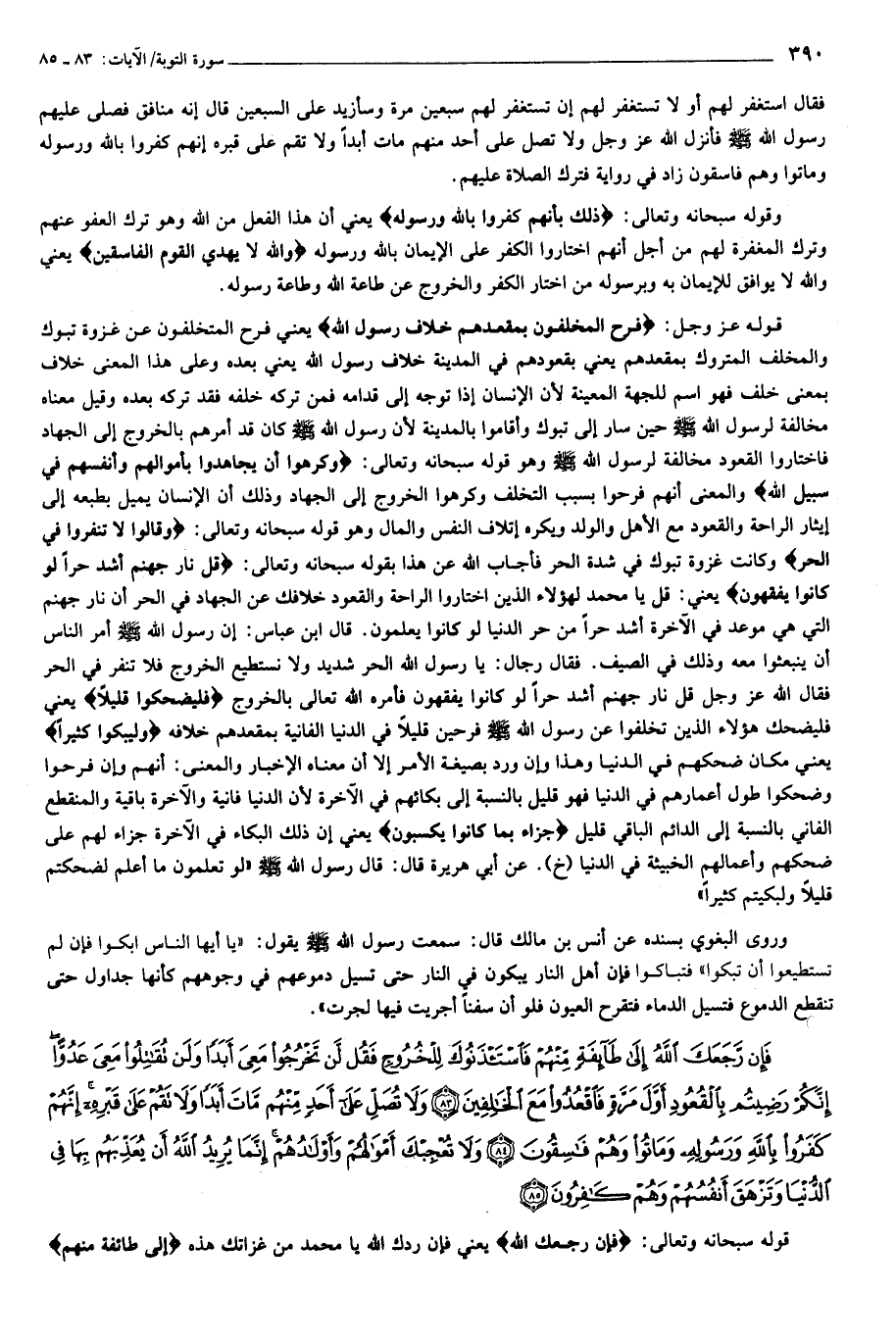 قوله عز وجل: فَرِحَ الْمُخَلَّفُونَ بِمَقْعَدِهِمْ خِلافَ رَسُولِ اللَّهِ يعني فرح المتخلفون عن غزوة تبوك والمخلف المتروك بمقعدهم يعني بقعودهم في المدينة خلاف رسول الله يعني بعده وعلى هذا المعنى خلاف بمعنى خلف فهو اسم للجهة المعينة لأن الإنسان إذا توجه إلى قدامه فمن تركه خلفه فقد تركه بعده وقيل معناه مخالفة لرسول الله صلى الله عليه وسلم حين سار إلى تبوك وأقاموا بالمدينة لأن رسول الله صلى الله عليه وسلم كان قد أمرهم بالخروج إلى الجهاد فاختاروا القعود مخالفة لرسول الله صلى الله عليه وسلم وهو قوله سبحانه وتعالى: وَكَرِهُوا أَنْ يُجاهِدُوا بِأَمْوالِهِمْ وَأَنْفُسِهِمْ فِي سَبِيلِ اللَّهِ والمعنى أنهم فرحوا بسبب التخلف وكرهوا الخروج إلى الجهاد وذلك أن الإنسان يميل بطبعه إلى إيثار الراحة والقعود مع الأهل والولد ويكره إتلاف النفس والمال وهو قوله سبحانه وتعالى: وَقالُوا لا تَنْفِرُوا فِي الْحَرِّ وكانت غزوة تبوك في شدة الحر فأجاب الله عن هذا بقوله سبحانه وتعالى: قُلْ نارُ جَهَنَّمَ أَشَدُّ حَرًّا لَوْ كانُوا يَفْقَهُونَ يعني: قل يا محمد لهؤلاء الذين اختاروا الراحة والقعود خلافك عن الجهاد في الحر أن نار جهنم التي هي موعد في الآخرة أشد حرا من حر الدنيا لو كانوا يعلمون. قال ابن عباس: إن رسول الله صلى الله عليه وسلم أمر الناس أن ينبعثوا معه وذلك في الصيف. فقال رجال: يا رسول الله الحر شديد ولا نستطيع الخروج فلا تنفر في الحر فقال الله عز وجل قل نار جهنم أشد حرا لو كانوا يفقهون فأمره الله تعالى بالخروج فَلْيَضْحَكُوا قَلِيلًا يعني فليضحك هؤلاء الذين تخلفوا عن رسول الله صلى الله عليه وسلم فرحين قليلا في الدنيا الفانية بمقعدهم خلافه وَلْيَبْكُوا كَثِيراً يعني مكان ضحكهم في الدنيا وهذا وإن ورد بصيغة الأمر إلا أن معناه الإخبار والمعنى: أنهم وإن فرحوا وضحكوا طول أعمارهم في الدنيا فهو قليل بالنسبة إلى بكائهم في الآخرة لأن الدنيا فانية والآخرة باقية والمنقطع الفاني بالنسبة إلى الدائم الباقي قليل جَزاءً بِما كانُوا يَكْسِبُونَ يعني إن ذلك البكاء في الآخرة جزاء لهم على ضحكهم وأعمالهم الخبيثة في الدنيا (خ). عن أبي هريرة قال: قال رسول الله صلى الله عليه وسلم «لو تعلمون ما أعلم لضحكتم قليلا ولبكيتم كثيرا» وروى البغوي بسنده عن أنس بن مالك قال: سمعت رسول الله صلى الله عليه وسلم يقول: «يا أيها الناس ابكوا فإن لم تستطيعوا أن تبكوا» فتباكوا فإن أهل النار يبكون في النار حتى تسيل دموعهم في وجوههم كأنها جداول حتى تنقطع الدموع فتسيل الدماء فتقرح العيون فلو أن سفنا أجريت فيها لجرت».