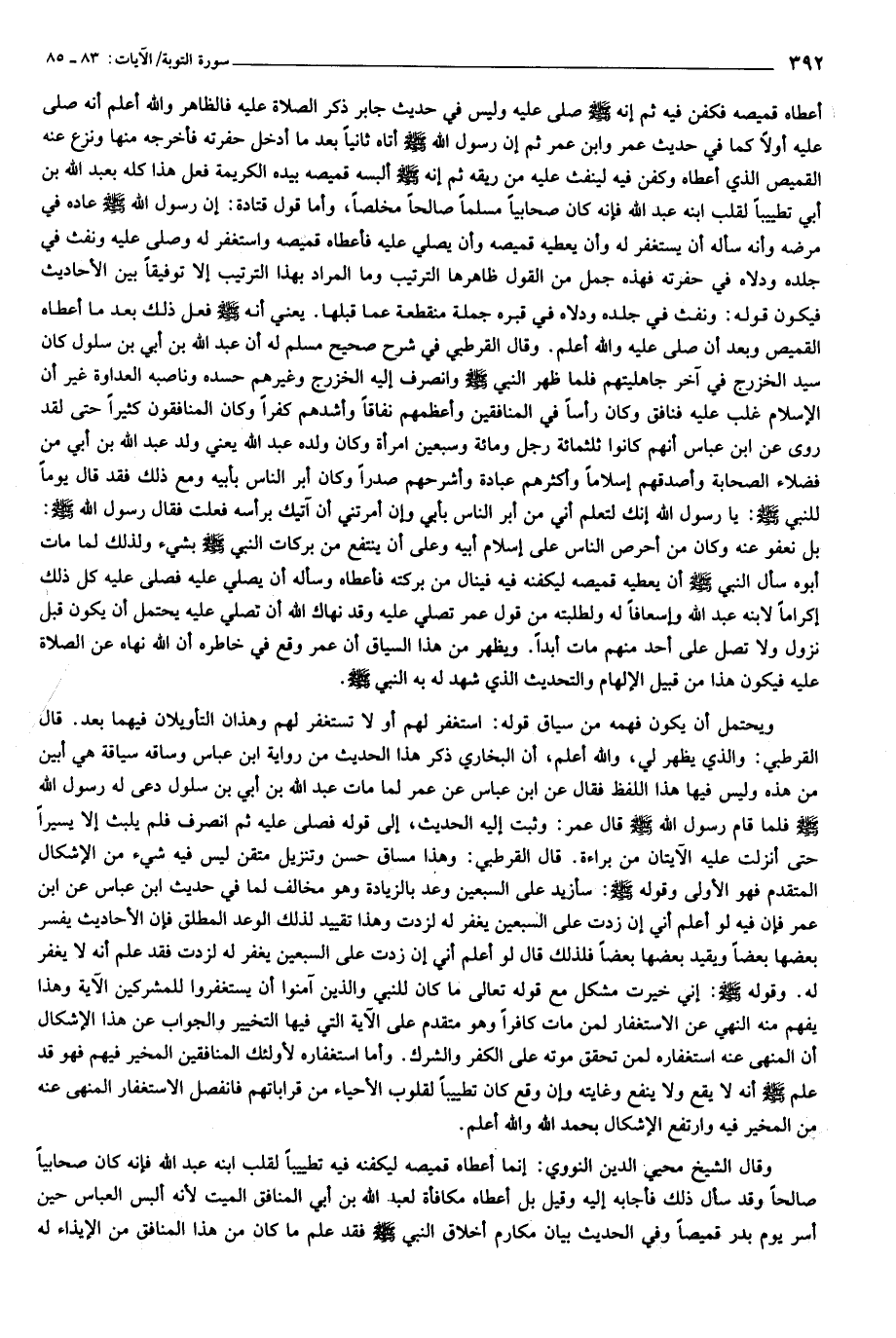 بل نعفو عنه وكان من أحرص الناس على إسلام أبيه وعلى أن ينتفع من بركات النبي صلى الله عليه وسلم بشيء ولذلك لما مات أبوه سأل النبي صلى الله عليه وسلم أن يعطيه قميصه ليكفنه فيه فينال من بركته فأعطاه وسأله أن يصلي عليه فصلى عليه كل ذلك إكراما لابنه عبد الله وإسعافا له ولطلبته من قول عمر تصلي عليه وقد نهاك الله أن تصلي عليه يحتمل أن يكون قبل نزول ولا تصل على أحد منهم مات أبدا. ويظهر من هذا السياق أن عمر وقع في خاطره أن الله نهاه عن الصلاة عليه فيكون هذا من قبيل الإلهام والتحديث الذي شهد له به النبي صلى الله عليه وسلم.