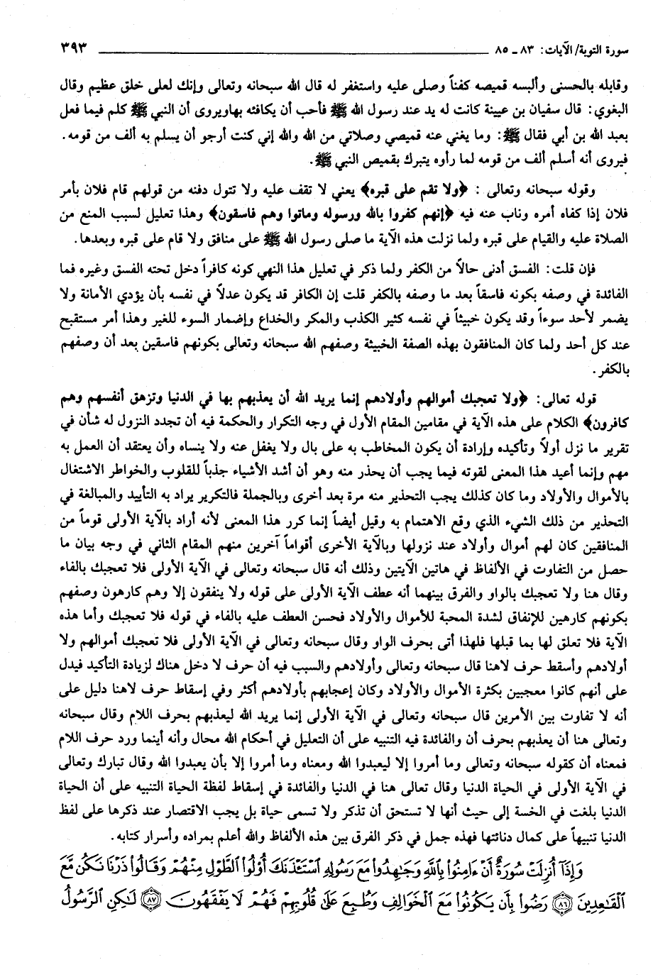 قوله تعالى: وَلا تُعْجِبْكَ أَمْوالُهُمْ وَأَوْلادُهُمْ إِنَّما يُرِيدُ اللَّهُ أَنْ يُعَذِّبَهُمْ بِها فِي الدُّنْيا وَتَزْهَقَ أَنْفُسُهُمْ وَهُمْ كافِرُونَ الكلام على هذه الآية في مقامين المقام الأول في وجه التكرار والحكمة فيه أن تجدد النزول له شأن في تقرير ما نزل أولا وتأكيده وإرادة أن يكون المخاطب به على بال ولا يغفل عنه ولا ينساه وأن يعتقد أن العمل به مهم وإنما أعيد هذا المعنى لقوته فيما يجب أن يحذر منه وهو أن أشد الأشياء جذبا للقلوب والخواطر الاشتغال بالأموال والأولاد وما كان كذلك يجب التحذير منه مرة بعد أخرى وبالجملة فالتكرير يراد به التأييد والمبالغة في التحذير من ذلك الشيء الذي وقع الاهتمام به وقيل أيضا إنما كرر هذا المعنى لأنه أراد بالآية الأولى قوما من المنافقين كان لهم أموال وأولاد عند نزولها وبالآية الأخرى أقواما آخرين منهم المقام الثاني في وجه بيان ما حصل من التفاوت في الألفاظ في هاتين الآيتين وذلك أنه قال سبحانه وتعالى في الآية الأولى فلا تعجبك بالفاء وقال هنا ولا تعجبك بالواو والفرق بينهما أنه عطف الآية الأولى على قوله ولا ينفقون إلا وهم كارهون وصفهم بكونهم كارهين للإنفاق لشدة المحبة للأموال والأولاد فحسن العطف عليه بالفاء في قوله فلا تعجبك وأما هذه الآية فلا تعلق لها بما قبلها فلهذا أتى بحرف الواو وقال سبحانه وتعالى في الآية الأولى فلا تعجبك أموالهم ولا أولادهم وأسقط حرف لا هنا قال سبحانه وتعالى وأولادهم والسبب فيه أن حرف لا دخل هناك لزيادة التأكيد فيدل على أنهم كانوا معجبين بكثرة الأموال والأولاد وكان إعجابهم بأولادهم أكثر وفي إسقاط حرف لا هنا دليل على أنه لا تفاوت بين الأمرين قال سبحانه وتعالى في الآية الأولى إنما يريد الله ليعذبهم بحرف اللام وقال سبحانه وتعالى هنا أن يعذبهم بحرف أن والفائدة فيه التنبيه على أن التعليل في أحكام الله محال وأنه أينما ورد حرف اللام فمعناه أن كقوله سبحانه وتعالى وما أمروا إلا ليعبدوا الله ومعناه وما أمروا إلا بأن يعبدوا الله وقال تبارك وتعالى في الآية الأولى في الحياة الدنيا وقال تعالى هنا في الدنيا والفائدة في إسقاط لفظة الحياة التنبيه على أن الحياة الدنيا بلغت في الخسة إلى حيث أنها لا تستحق أن تذكر ولا تسمى حياة بل يجب الاقتصار عند ذكرها على لفظ الدنيا تنبيها على كمال دنائتها فهذه جمل في ذكر الفرق بين هذه الألفاظ والله أعلم بمراده وأسرار كتابه.