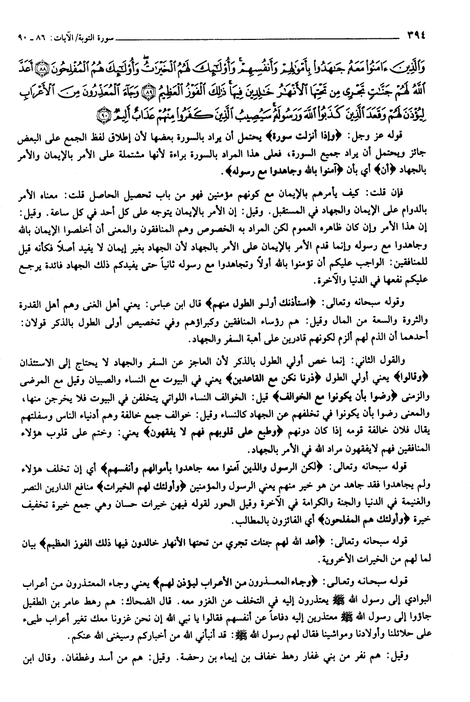 وَإِذا أُنْزِلَتْ سُورَةٌ أَنْ آمِنُوا بِاللَّهِ وَجاهِدُوا مَعَ رَسُولِهِ اسْتَأْذَنَكَ أُولُوا الطَّوْلِ مِنْهُمْ وَقالُوا ذَرْنا نَكُنْ مَعَ الْقاعِدِينَ (86) رَضُوا بِأَنْ يَكُونُوا مَعَ الْخَوالِفِ وَطُبِعَ عَلى قُلُوبِهِمْ فَهُمْ لا يَفْقَهُونَ (87) لكِنِ الرَّسُولُ وَالَّذِينَ آمَنُوا مَعَهُ جاهَدُوا بِأَمْوالِهِمْ وَأَنْفُسِهِمْ وَأُولئِكَ لَهُمُ الْخَيْراتُ وَأُولئِكَ هُمُ الْمُفْلِحُونَ (88) أَعَدَّ اللَّهُ لَهُمْ جَنَّاتٍ تَجْرِي مِنْ تَحْتِهَا الْأَنْهارُ خالِدِينَ فِيها ذلِكَ الْفَوْزُ الْعَظِيمُ (89) وَجاءَ الْمُعَذِّرُونَ مِنَ الْأَعْرابِ لِيُؤْذَنَ لَهُمْ وَقَعَدَ الَّذِينَ كَذَبُوا اللَّهَ وَرَسُولَهُ سَيُصِيبُ الَّذِينَ كَفَرُوا مِنْهُمْ عَذابٌ أَلِيمٌ (90)