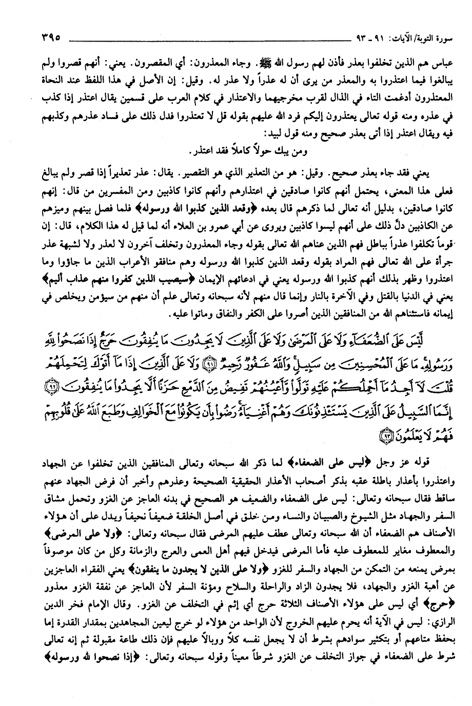 لَيْسَ عَلَى الضُّعَفاءِ وَلا عَلَى الْمَرْضى وَلا عَلَى الَّذِينَ لا يَجِدُونَ ما يُنْفِقُونَ حَرَجٌ إِذا نَصَحُوا لِلَّهِ وَرَسُولِهِ ما عَلَى الْمُحْسِنِينَ مِنْ سَبِيلٍ وَاللَّهُ غَفُورٌ رَحِيمٌ (91) وَلا عَلَى الَّذِينَ إِذا ما أَتَوْكَ لِتَحْمِلَهُمْ قُلْتَ لا أَجِدُ ما أَحْمِلُكُمْ عَلَيْهِ تَوَلَّوْا وَأَعْيُنُهُمْ تَفِيضُ مِنَ الدَّمْعِ حَزَناً أَلاَّ يَجِدُوا ما يُنْفِقُونَ (92) إِنَّمَا السَّبِيلُ عَلَى الَّذِينَ يَسْتَأْذِنُونَكَ وَهُمْ أَغْنِياءُ رَضُوا بِأَنْ يَكُونُوا مَعَ الْخَوالِفِ وَطَبَعَ اللَّهُ عَلى قُلُوبِهِمْ فَهُمْ لا يَعْلَمُونَ (93)