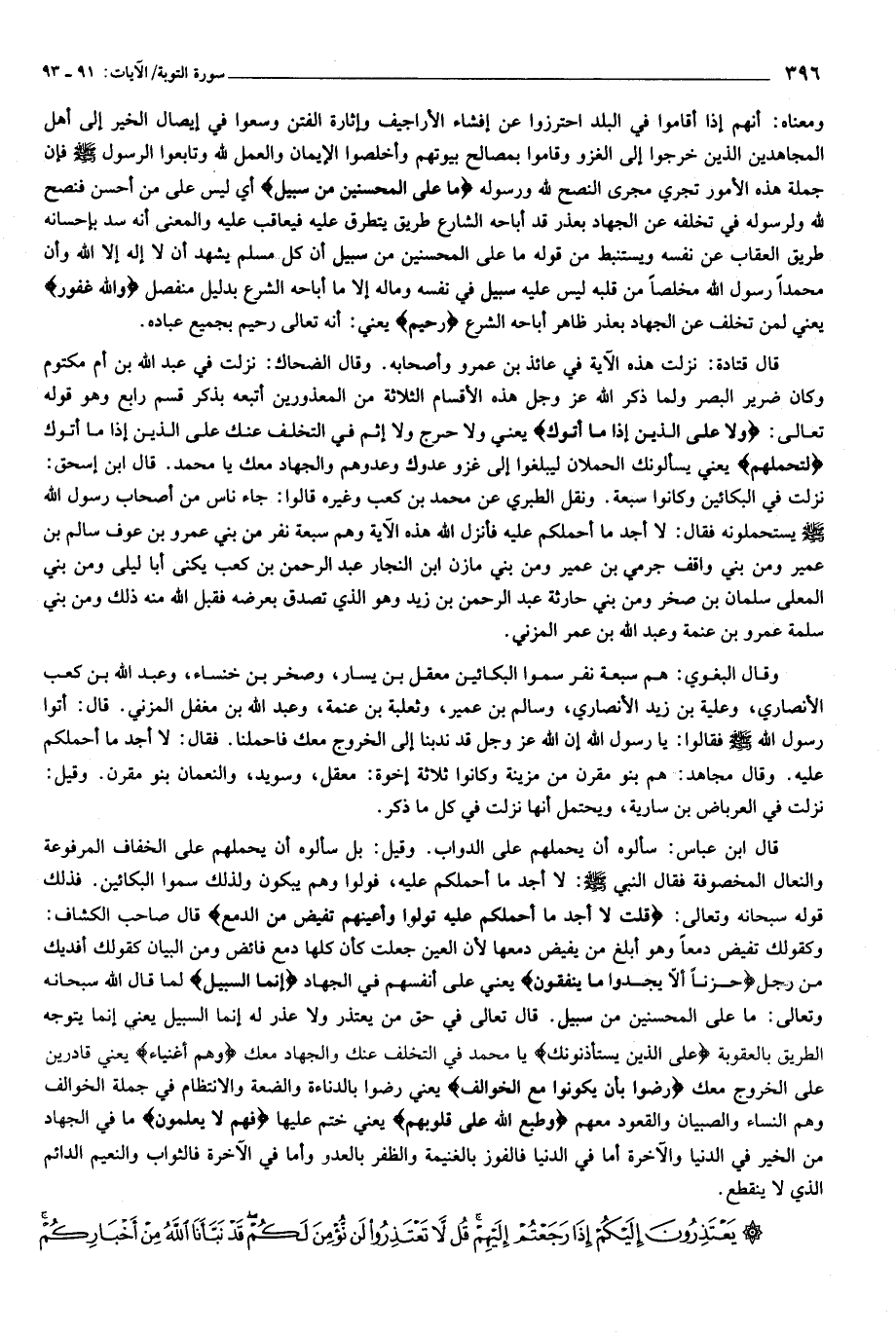 نزلت في البكائين وكانوا سبعة. ونقل الطبري عن محمد بن كعب وغيره قالوا: جاء ناس من أصحاب رسول الله صلى الله عليه وسلم يستحملونه فقال: لا أجد ما أحملكم عليه فأنزل الله هذه الآية وهم سبعة نفر من بني عمرو بن عوف سالم بن عمير ومن بني واقف جرمي بن عمير ومن بني مازن ابن النجار عبد الرحمن بن كعب يكنى أبا ليلى ومن بني المعلى سلمان بن صخر ومن بني حارثة عبد الرحمن بن زيد وهو الذي تصدق بعرضه فقبل الله منه ذلك ومن بني سلمة عمرو بن عنمة وعبد الله بن عمر المزني.
