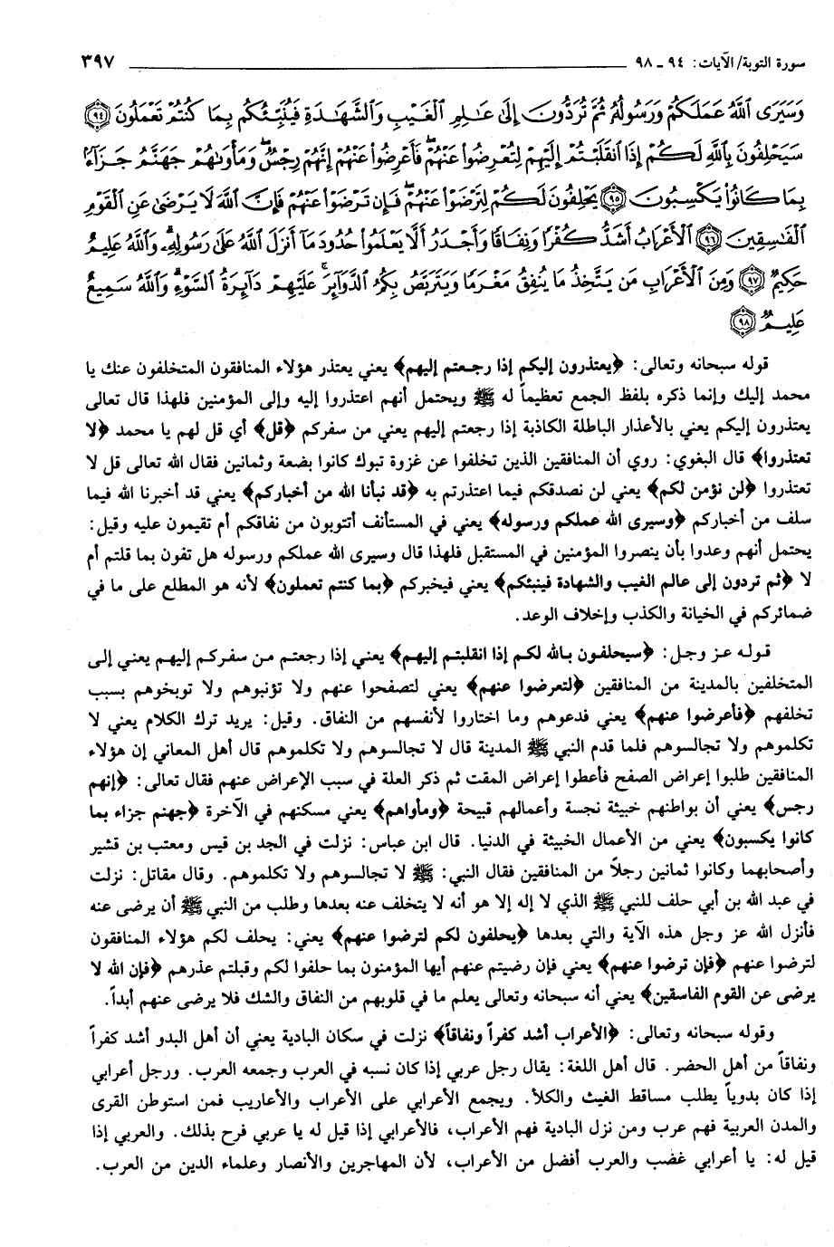 يَعْتَذِرُونَ إِلَيْكُمْ إِذا رَجَعْتُمْ إِلَيْهِمْ قُلْ لا تَعْتَذِرُوا لَنْ نُؤْمِنَ لَكُمْ قَدْ نَبَّأَنَا اللَّهُ مِنْ أَخْبارِكُمْ وَسَيَرَى اللَّهُ عَمَلَكُمْ وَرَسُولُهُ ثُمَّ تُرَدُّونَ إِلى عالِمِ الْغَيْبِ وَالشَّهادَةِ فَيُنَبِّئُكُمْ بِما كُنْتُمْ تَعْمَلُونَ (94) سَيَحْلِفُونَ بِاللَّهِ لَكُمْ إِذَا انْقَلَبْتُمْ إِلَيْهِمْ لِتُعْرِضُوا عَنْهُمْ فَأَعْرِضُوا عَنْهُمْ إِنَّهُمْ رِجْسٌ وَمَأْواهُمْ جَهَنَّمُ جَزاءً بِما كانُوا يَكْسِبُونَ (95) يَحْلِفُونَ لَكُمْ لِتَرْضَوْا عَنْهُمْ فَإِنْ تَرْضَوْا عَنْهُمْ فَإِنَّ اللَّهَ لا يَرْضى عَنِ الْقَوْمِ الْفاسِقِينَ (96) الْأَعْرابُ أَشَدُّ كُفْراً وَنِفاقاً وَأَجْدَرُ أَلاَّ يَعْلَمُوا حُدُودَ ما أَنْزَلَ اللَّهُ عَلى رَسُولِهِ وَاللَّهُ عَلِيمٌ حَكِيمٌ (97) وَمِنَ الْأَعْرابِ مَنْ يَتَّخِذُ ما يُنْفِقُ مَغْرَماً وَيَتَرَبَّصُ بِكُمُ الدَّوائِرَ عَلَيْهِمْ دائِرَةُ السَّوْءِ وَاللَّهُ سَمِيعٌ عَلِيمٌ (98)