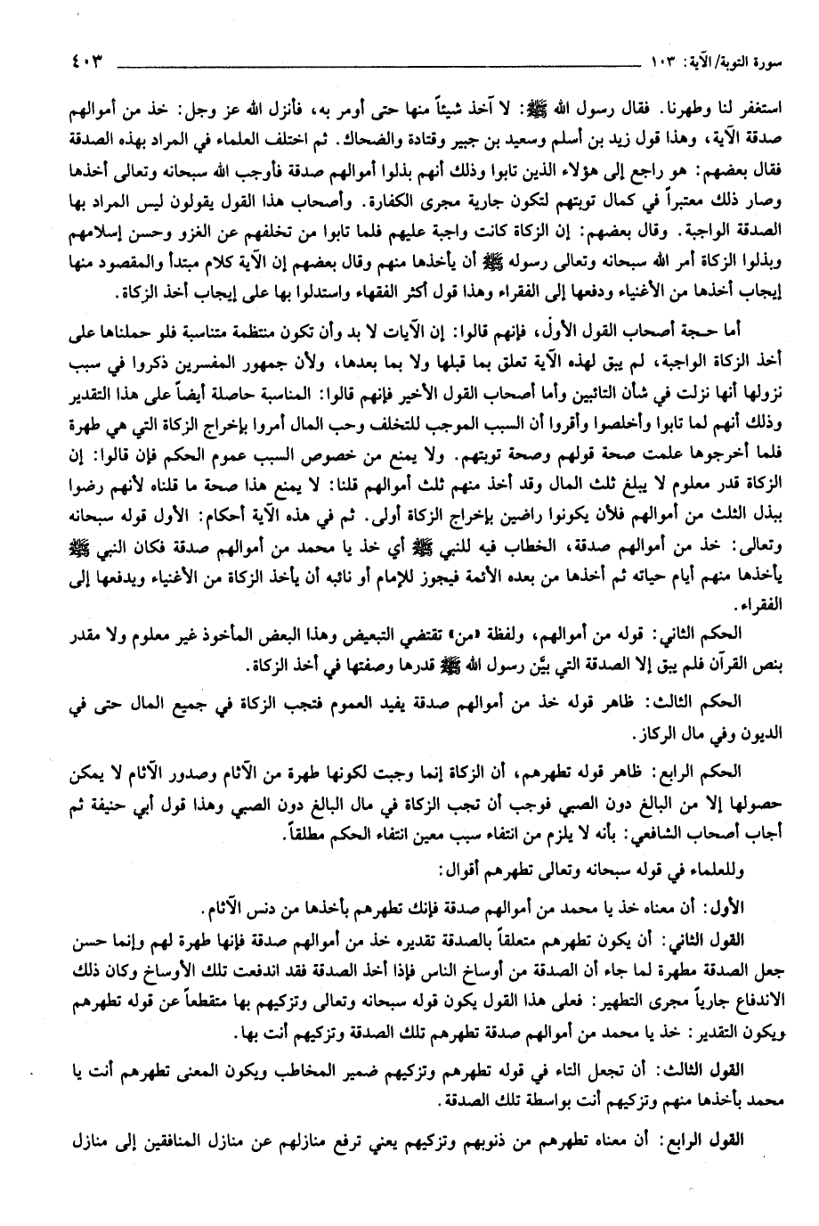 أما حجة أصحاب القول الأول، فإنهم قالوا: إن الآيات لا بد وأن تكون منتظمة متناسبة فلو حملناها على أخذ الزكاة الواجبة، لم يبق لهذه الآية تعلق بما قبلها ولا بما بعدها، ولأن جمهور المفسرين ذكروا في سبب نزولها أنها نزلت في شأن التائبين وأما أصحاب القول الأخير فإنهم قالوا: المناسبة حاصلة أيضا على هذا التقدير وذلك أنهم لما تابوا وأخلصوا وأقروا أن السبب الموجب للتخلف وحب المال أمروا بإخراج الزكاة التي هي طهرة فلما أخرجوها علمت صحة قولهم وصحة توبتهم. ولا يمنع من خصوص السبب عموم الحكم فإن قالوا: إن الزكاة قدر معلوم لا يبلغ ثلث المال وقد أخذ منهم ثلث أموالهم قلنا: لا يمنع هذا صحة ما قلناه لأنهم رضوا ببذل الثلث من أموالهم فلأن يكونوا راضين بإخراج الزكاة أولى. ثم في هذه الآية أحكام: الأول قوله سبحانه وتعالى: خُذْ مِنْ أَمْوالِهِمْ صَدَقَةً، الخطاب فيه للنبي صلى الله عليه وسلم أي خذ يا محمد من أموالهم صدقة فكان النبي صلى الله عليه وسلم يأخذها منهم أيام حياته ثم أخذها من بعده الأئمة فيجوز للإمام أو نائبه أن يأخذ الزكاة من الأغنياء ويدفعها إلى الفقراء.