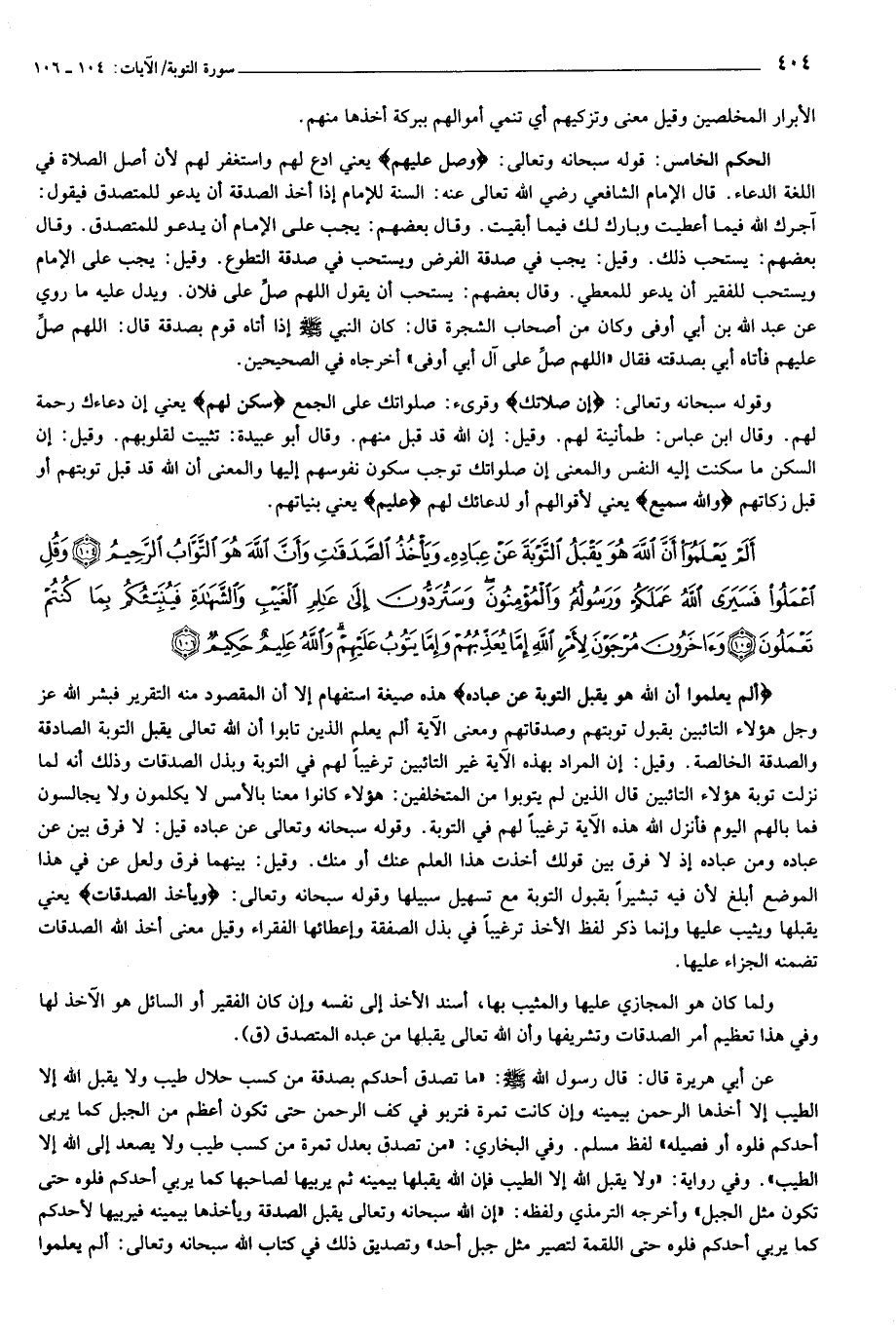 أَلَمْ يَعْلَمُوا أَنَّ اللَّهَ هُوَ يَقْبَلُ التَّوْبَةَ عَنْ عِبادِهِ وَيَأْخُذُ الصَّدَقاتِ وَأَنَّ اللَّهَ هُوَ التَّوَّابُ الرَّحِيمُ (104) وَقُلِ اعْمَلُوا فَسَيَرَى اللَّهُ عَمَلَكُمْ وَرَسُولُهُ وَالْمُؤْمِنُونَ وَسَتُرَدُّونَ إِلى عالِمِ الْغَيْبِ وَالشَّهادَةِ فَيُنَبِّئُكُمْ بِما كُنْتُمْ تَعْمَلُونَ (105) وَآخَرُونَ مُرْجَوْنَ لِأَمْرِ اللَّهِ إِمَّا يُعَذِّبُهُمْ وَإِمَّا يَتُوبُ عَلَيْهِمْ وَاللَّهُ عَلِيمٌ حَكِيمٌ (106)