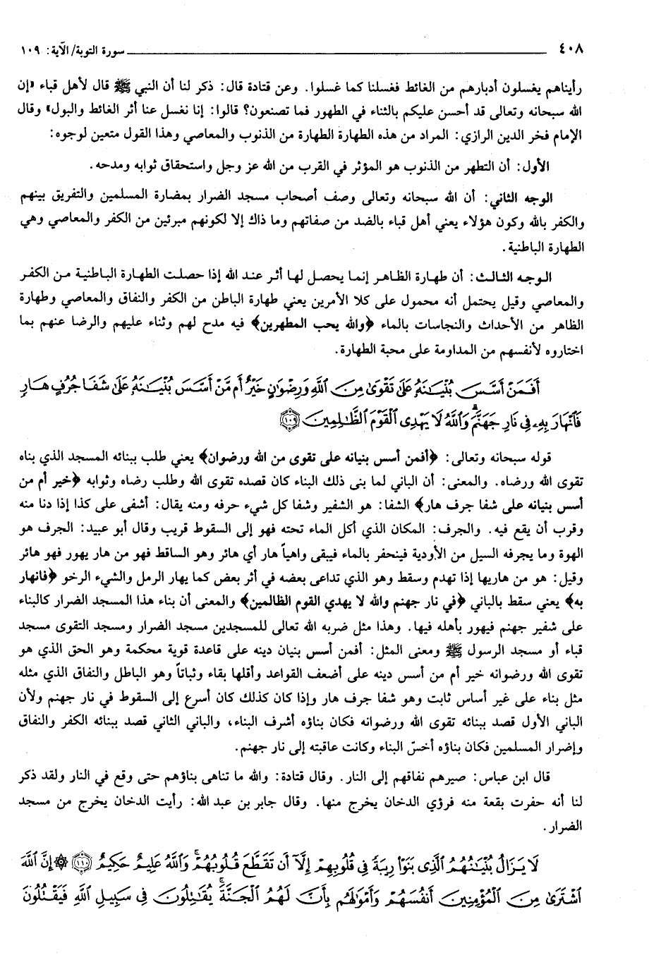 قوله سبحانه وتعالى: أَفَمَنْ أَسَّسَ بُنْيانَهُ عَلى تَقْوى مِنَ اللَّهِ وَرِضْوانٍ يعني طلب ببنائه المسجد الذي بناه تقوى الله ورضاه. والمعنى: أن الباني لما بنى ذلك البناء كان قصده تقوى الله وطلب رضاه وثوابه خَيْرٌ أَمْ مَنْ أَسَّسَ بُنْيانَهُ عَلى شَفا جُرُفٍ هارٍ الشفا: هو الشفير وشفا كل شيء حرفه ومنه يقال: أشفى على كذا إذا دنا منه وقرب أن يقع فيه. والجرف: المكان الذي أكل الماء تحته فهو إلى السقوط قريب وقال أبو عبيد: الجرف هو الهوة وما يجرفه السيل من الأودية فينحفر بالماء فيبقى واهيا هار أي هائر وهو الساقط فهو من هار يهور فهو هائر وقيل: هو من هاريها إذا تهدم وسقط وهو الذي تداعى بعضه في أثر بعض كما يهار الرمل والشيء الرخو فَانْهارَ بِهِ يعني سقط بالباني فِي نارِ جَهَنَّمَ وَاللَّهُ لا يَهْدِي الْقَوْمَ الظَّالِمِينَ والمعنى أن بناء هذا المسجد الضرار كالبناء على شفير جهنم فيهور بأهله فيها. وهذا مثل ضربه الله تعالى للمسجدين مسجد الضرار ومسجد التقوى مسجد قباء أو مسجد الرسول صلى الله عليه وسلم ومعنى المثل: أفمن أسس بنيان دينه على قاعدة قوية محكمة وهو الحق الذي هو تقوى الله ورضوانه خير أم من أسس دينه على أضعف القواعد وأقلها بقاء وثباتا وهو الباطل والنفاق الذي مثله مثل بناء على غير أساس ثابت وهو شفا جرف هار وإذا كان كذلك كان أسرع إلى السقوط في نار جهنم ولأن الباني الأول قصد ببنائه تقوى الله ورضوانه فكان بناؤه أشرف البناء، والباني الثاني قصد ببنائه الكفر والنفاق وإضرار المسلمين فكان بناؤه أخسّ البناء وكانت عاقبته إلى نار جهنم.