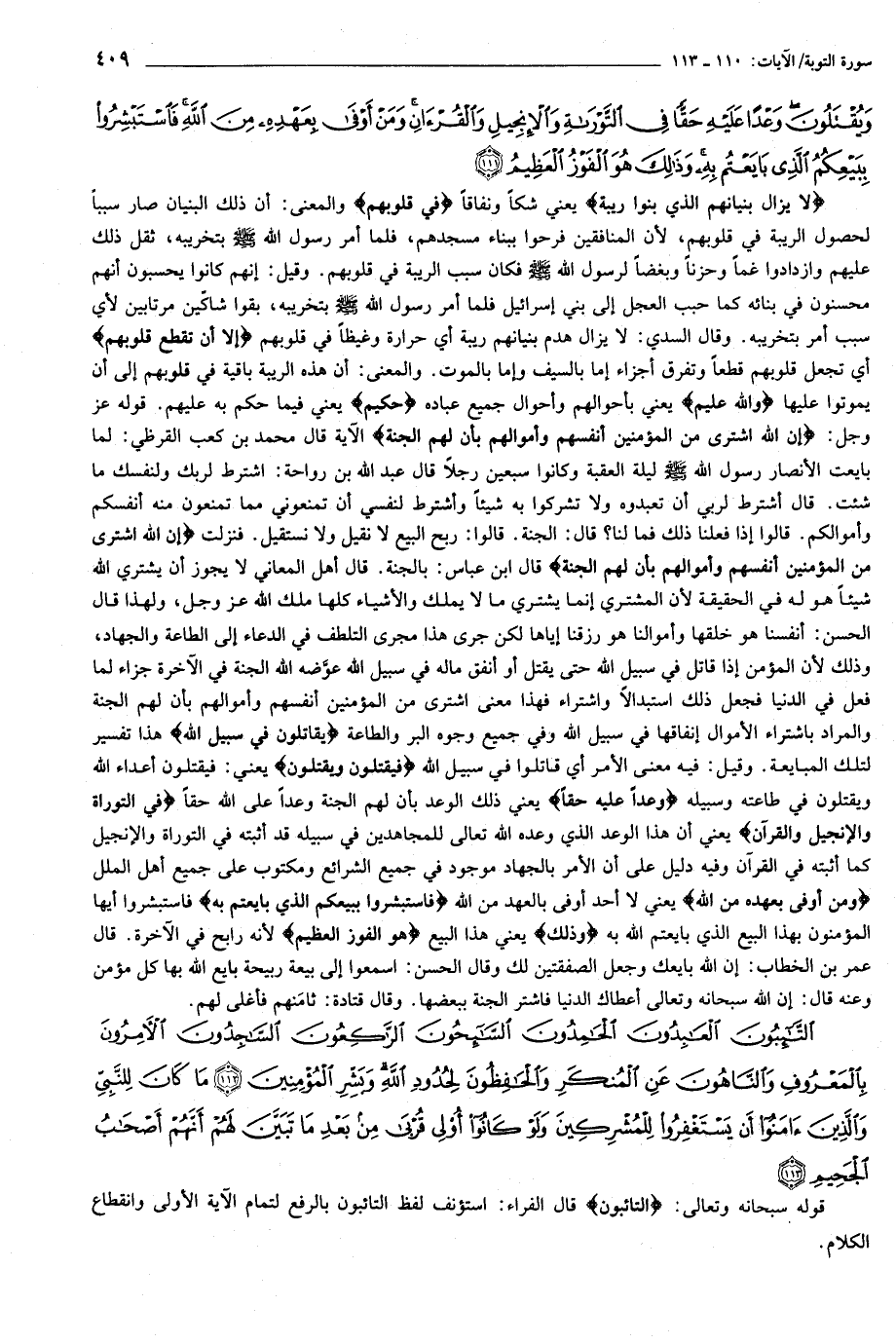 لا يَزالُ بُنْيانُهُمُ الَّذِي بَنَوْا رِيبَةً فِي قُلُوبِهِمْ إِلاَّ أَنْ تَقَطَّعَ قُلُوبُهُمْ وَاللَّهُ عَلِيمٌ حَكِيمٌ (110) إِنَّ اللَّهَ اشْتَرى مِنَ الْمُؤْمِنِينَ أَنْفُسَهُمْ وَأَمْوالَهُمْ بِأَنَّ لَهُمُ الْجَنَّةَ يُقاتِلُونَ فِي سَبِيلِ اللَّهِ فَيَقْتُلُونَ وَيُقْتَلُونَ وَعْداً عَلَيْهِ حَقًّا فِي التَّوْراةِ وَالْإِنْجِيلِ وَالْقُرْآنِ وَمَنْ أَوْفى بِعَهْدِهِ مِنَ اللَّهِ فَاسْتَبْشِرُوا بِبَيْعِكُمُ الَّذِي بايَعْتُمْ بِهِ وَذلِكَ هُوَ الْفَوْزُ الْعَظِيمُ (111)