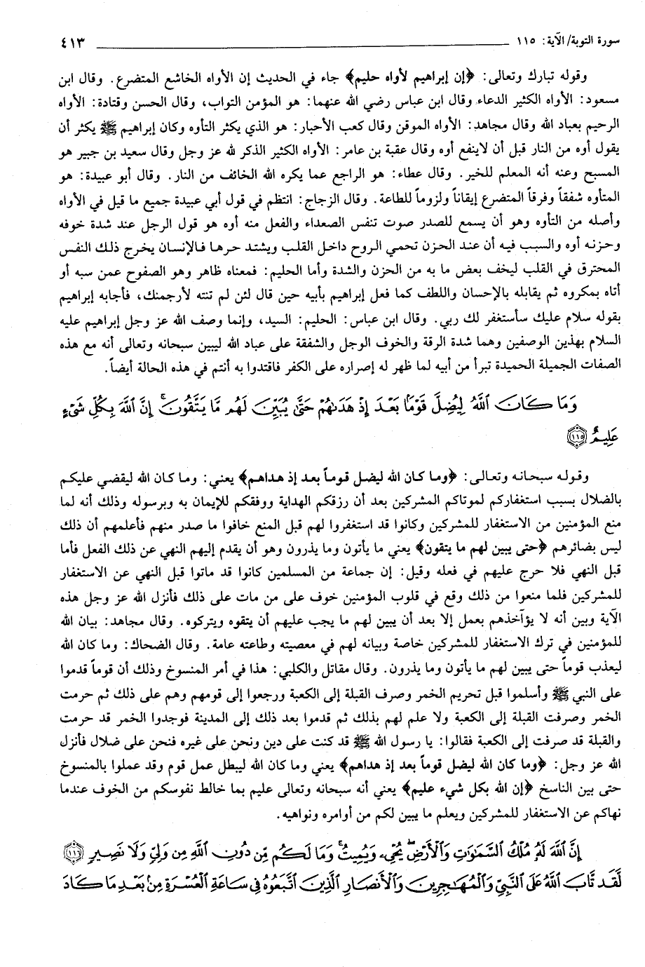 وقوله تبارك وتعالى: إِنَّ إِبْراهِيمَ لَأَوَّاهٌ حَلِيمٌ جاء في الحديث إن الأواه الخاشع المتضرع. وقال ابن مسعود: الأواه الكثير الدعاء وقال ابن عباس رضي الله عنهما: هو المؤمن التواب، وقال الحسن وقتادة: الأواه الرحيم بعباد الله وقال مجاهد: الأواه الموقن وقال كعب الأحبار: هو الذي يكثر التأوه وكان إبراهيم صلى الله عليه وسلم يكثر أن يقول أوه من النار قبل أن لا ينفع أوه وقال عقبة بن عامر: الأواه الكثير الذكر لله عز وجل وقال سعيد بن جبير هو المسبح وعنه أنه المعلم للخير. وقال عطاء: هو الراجع عما يكره الله الخائف من النار. وقال أبو عبيدة: هو المتأوه شفقا وفرقا المتضرع إيقانا ولزوما للطاعة. وقال الزجاج: انتظم في قول أبي عبيدة جميع ما قيل في الأواه وأصله من التأوه وهو أن يسمع للصدر صوت تنفس الصعداء والفعل منه أوه هو قول الرجل عند شدة خوفه وحزنه أوه والسبب فيه أن عند الحزن تحمي الروح داخل القلب ويشتد حرها فالإنسان يخرج ذلك النفس المحترق في القلب ليخف بعض ما به من الحزن والشدة وأما الحليم: فمعناه ظاهر وهو الصفوح عمن سبه أو أتاه بمكروه ثم يقابله بالإحسان واللطف كما فعل إبراهيم بأبهى حين قال لئن لم تنته لأرجمنك، فأجابه إبراهيم بقوله سلام عليك سأستغفر لك ربي. وقال ابن عباس: الحليم: السيد، وإنما وصف الله عز وجل إبراهيم عليه السلام بهذين الوصفين وهما شدة الرقة والخوف الوجل والشفقة على عباد الله ليبين سبحانه وتعالى أنه مع هذه الصفات الجميلة الحميدة تبرأ من أبيه لما ظهر له إصراره على الكفر فاقتدوا به أنتم في هذه الحالة أيضا.