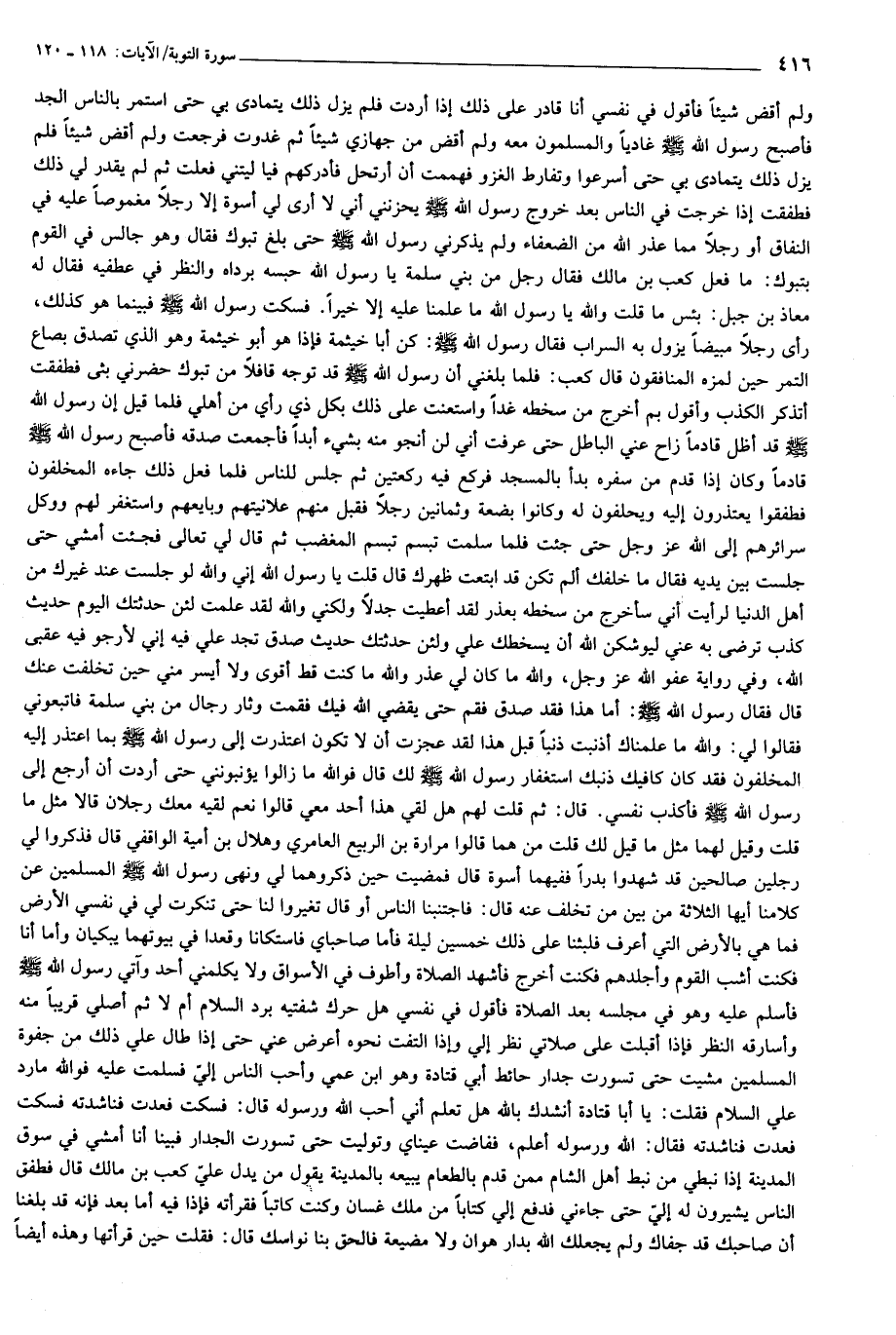 رأي من أهلي فلما قيل إن رسول الله صلى الله عليه وسلم قد أظل قادما زاح عني الباطل حتى عرفت أني لن أنجو منه بشيء أبدا فأجمعت صدقه فأصبح رسول الله صلى الله عليه وسلم قادما وكان إذا قدم من سفره بدأ بالمسجد فركع فيه ركعتين ثم جلس للناس فلما فعل ذلك جاءه المخلفون فطفقوا يعتذرون إليه ويحلفون له وكانوا بضعة وثمانين رجلا فقبل منهم علانيتهم وبايعهم واستغفر لهم ووكل سرائرهم إلى الله عز وجل حتى جئت فلما سلمت تبسم تبسم المغضب ثم قال لي تعالى فجئت أمشي حتى جلست بين يديه فقال ما خلفك ألم تكن قد ابتعت ظهرك قال قلت يا رسول الله إني والله لو جلست عند غيرك من أهل الدنيا لرأيت أني سأخرج من سخطه بعذر لقد أعطيت جدلا ولكني والله لقد علمت لئن حدثتك اليوم حديث كذب ترضى به عني ليوشكن الله أن يسخطك علي ولئن حدثتك حديث صدق تجد علي فيه إني لأرجو فيه عقبى الله، وفي رواية عفو الله عز وجل، والله ما كان لي عذر والله ما كنت قط أقوى ولا أيسر مني حين تخلفت عنك قال فقال رسول الله صلى الله عليه وسلم: أما هذا فقد صدق فقم حتى يقضي الله فيك فقمت وثار رجال من بني سلمة فاتبعوني فقالوا لي: والله ما علمناك أذنبت ذنبا قبل هذا لقد عجزت أن لا تكون اعتذرت إلى رسول الله صلى الله عليه وسلم بما اعتذر إليه المخلفون فقد كان كافيك ذنبك استغفار رسول الله صلى الله عليه وسلم لك قال فو الله ما زالوا يؤنبونني حتى أردت أن أرجع إلى رسول الله صلى الله عليه وسلم فأكذب نفسي. قال: ثم قلت لهم هل لقي هذا أحد معي قالوا نعم لقيه معك رجلان قالا مثل ما قلت وقيل لهما مثل ما قيل لك قلت من هما قالوا مرارة بن الربيع العامري وهلال بن أمية الواقفي قال فذكروا لي رجلين صالحين قد شهدوا بدرا ففيهما أسوة قال فمضيت حين ذكروهما لي ونهى رسول الله صلى الله عليه وسلم المسلمين عن كلامنا أيها الثلاثة من بين من تخلف عنه قال: فاجتنبنا الناس أو قال تغيروا لنا حتى تنكرت لي في نفسي الأرض فما هي بالأرض التي أعرف فلبثنا على ذلك خمسين ليلة فأما صاحباي فاستكانا وقعدا في بيوتهما يبكيان وأما أنا فكنت أشب القوم وأجلدهم فكنت أخرج فأشهد الصلاة وأطوف في الأسواق ولا يكلمني أحد وآتي رسول الله صلى الله عليه وسلم فأسلم عليه وهو في مجلسه بعد الصلاة فأقول في نفسي هل حرك شفتيه برد السلام أم لا ثم أصلي قريبا منه وأسارقه النظر فإذا أقبلت على صلاتي نظر إلي وإذا التفت نحوه أعرض عني حتى إذا طال علي ذلك من جفوة المسلمين مشيت حتى تسورت جدار حائط أبي قتادة وهو ابن عمي وأحب الناس إليّ فسلمت عليه فو الله مارد علي السلام فقلت: يا أبا قتادة أنشدك بالله هل تعلم أني أحب الله ورسوله قال: فسكت فعدت فناشدته فسكت فعدت فناشدته فقال: الله ورسوله أعلم، ففاضت عيناي وتوليت حتى تسورت الجدار فبينا أنا أمشي في سوق المدينة إذا نبطي من نبط أهل الشام ممن قدم بالطعام يبيعه بالمدينة يقول من يدل عليّ كعب بن مالك قال فطفق الناس يشيرون له إليّ حتى جاءني فدفع إلي كتابا من ملك غسان وكنت كاتبا فقرأته فإذا فيه أما بعد فإنه قد بلغنا أن صاحبك قد جفاك ولم يجعلك الله بدار هوان ولا مضيعة فالحق بنا نواسيك قال: فقلت حين قرأتها وهذه أيضا