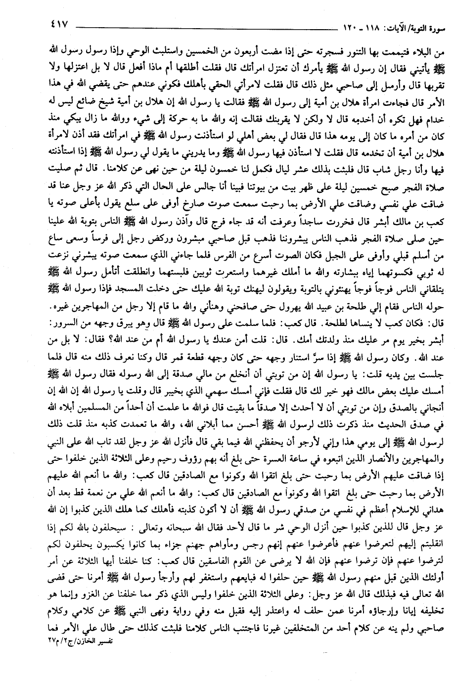 أبشر بخير يوم مر عليك منذ ولدتك أمك. قال: قلت أمن عندك يا رسول الله أم من عند الله؟ فقال: لا بل من عند الله. وكان رسول الله صلى الله عليه وسلم إذا سرّ استنار وجهه حتى كان وجهه قطعة قمر قال وكنا نعرف ذلك منه قال فلما جلست بين يديه قلت: يا رسول الله إن من توبتي أن أنخلع من مالي صدقة إلى الله رسوله فقال رسول الله صلى الله عليه وسلم أمسك عليك بعض مالك فهو خير لك قال فقلت فإني أمسك سهمي الذي بخيبر قال وقلت يا رسول الله إن الله إن أنجاني بالصدق وإن من توبتي أن لا أحدث إلا صدقا ما بقيت قال فو الله ما علمت أن أحدا من المسلمين أبلاه الله في صدق الحديث منذ ذكرت ذلك لرسول الله صلى الله عليه وسلم أحسن مما أبلاني الله، والله ما تعمدت كذبه منذ قلت ذلك لرسول الله صلى الله عليه وسلم إلى يومي هذا وإني لأرجو أن يحفظني الله فيما بقي قال فأنزل الله عز وجل لقد تاب الله على النبي والمهاجرين والأنصار الذين اتبعوه في ساعة العسرة حتى بلغ أنه بهم رؤوف رحيم وعلى الثلاثة الذين خلفوا حتى إذا ضاقت عليهم الأرض بما رحبت حتى بلغ اتقوا الله وكونوا مع الصادقين قال كعب: والله ما أنعم الله عليهم الأرض بما رحبت حتى بلغ اتقوا الله وكونوا مع الصادقين قال كعب: والله ما أنعم الله علي من نعمة قط بعد أن هداني للإسلام أعظم في نفسي من صدقي رسول الله صلى الله عليه وسلم أن لا أكون كذبته فأهلك كما هلك الذين كذبوا إن الله عز وجل قال للذين كذبوا حين أنزل الوحي شر ما قال لأحد فقال الله سبحانه وتعالى: سَيَحْلِفُونَ بِاللَّهِ لَكُمْ إِذَا انْقَلَبْتُمْ إِلَيْهِمْ لِتُعْرِضُوا عَنْهُمْ فَأَعْرِضُوا عَنْهُمْ إِنَّهُمْ رِجْسٌ وَمَأْواهُمْ جَهَنَّمُ جَزاءً بِما كانُوا يَكْسِبُونَ يَحْلِفُونَ لَكُمْ لِتَرْضَوْا عَنْهُمْ فَإِنْ تَرْضَوْا عَنْهُمْ فَإِنَّ اللَّهَ لا يَرْضى عَنِ الْقَوْمِ الْفاسِقِينَ قال كعب: كنا خلفنا أيها الثلاثة عن أمر أولئك الذين قبل منهم رسول الله صلى الله عليه وسلم حين حلفوا له فبايعهم واستغفر لهم وأرجأ رسول الله صلى الله عليه وسلم أمرنا حتى قضى الله تعالى فيه فبذلك قال الله عز وجل: وَعَلَى الثَّلاثَةِ الَّذِينَ خُلِّفُوا وليس الذي ذكر مما خلفنا عن الغزو وإنما هو تخليفه إيانا وإرجاؤه أمرنا عمن حلف له واعتذر إليه فقبل منه وفي رواية ونهى النبي صلى الله عليه وسلم عن كلامي وكلام صاحبي ولم ينه عن كلام أحد من المتخلفين غيرنا فاجتنب الناس كلامنا فلبثت كذلك حتى طال علي الأمر فما