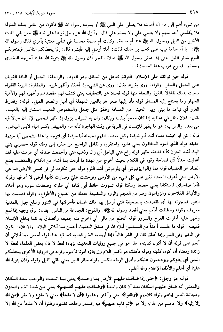 من شيء أهم إلي من أن أموت فلا يصلي علي النبي صلى الله عليه وسلم أو يموت رسول الله صلى الله عليه وسلم فأكون من الناس بتلك المنزلة فلا يكلمني أحد منهم ولا يصلي علي ولا يسلم علي قال: وأنزل الله عز وجل توبتنا على نبيه صلى الله عليه وسلم حين بقي الثلث الأخير من الليل ورسول الله صلى الله عليه وسلم عند أم سلمة. وكانت أم سلمة محسنة في شأني معتنية بأمري فقال رسول الله صلى الله عليه وسلم: يا أم سلمة تيب على كعب بن مالك قالت: أفلا أرسل إليه فأبشره قال: إذا يحطمكم الناغس فيمنعونكم النوم سائر الليل حتى إذا صلى رسول الله صلى الله عليه وسلم صلاة الفجر آذن رسول الله صلى الله عليه وسلم بتوبة الله علينا أخرجه البخاري ومسلم. (شرح غريب هذا الحديث) ..