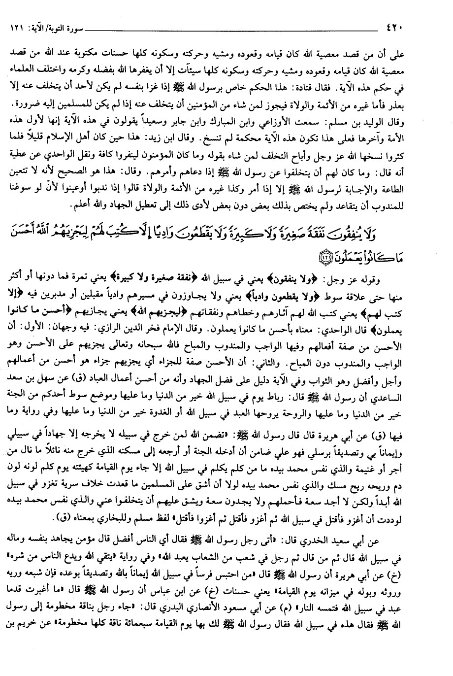 وقوله عز وجل: وَلا يُنْفِقُونَ يعني في سبيل الله نَفَقَةً صَغِيرَةً وَلا كَبِيرَةً يعني تمرة فما دونها أو أكثر منها حتى علاقة سوط وَلا يَقْطَعُونَ وادِياً يعني ولا يجاوزون في مسيرهم واديا مقبلين أو مدبرين فيه إِلَّا كُتِبَ لَهُمْ يعني كتب الله لهم آثارهم وخطاهم ونفقاتهم لِيَجْزِيَهُمُ اللَّهُ يعني يجازيهم أَحْسَنَ ما كانُوا يَعْمَلُونَ قال الواحدي: معناه بأحسن ما كانوا يعملون. وقال الإمام فخر الدين الرازي: فيه وجهان: الأول: أن الأحسن من صفة أفعالهم وفيها الواجب والمندوب والمباح فالله سبحانه وتعالى يجزيهم على الأحسن وهو الواجب والمندوب دون المباح. والثاني: أن الأحسن صفة للجزاء أي يجزيهم جزاء هو أحسن من أعمالهم وأجل وأفضل وهو الثواب وفي الآية دليل على فضل الجهاد وأنه من أحسن أعمال العباد (ق) عن سهل بن سعد الساعدي أن رسول الله صلى الله عليه وسلم قال: رباط يوم في سبيل الله خير من الدنيا وما عليها وموضع سوط أحدكم من الجنة خير من الدنيا وما عليها والروحة يروحها العبد في سبيل الله أو الغدوة خير من الدنيا وما عليها وفي رواية وما فيها (ق) عن أبي هريرة قال قال رسول الله صلى الله عليه وسلم: «تضمن الله لمن خرج في سبيله لا يخرجه إلا جهادا في سبيلي وإيمانا بي وتصديقا برسلي فهو علي ضامن أن أدخله الجنة أو أرجعه إلى مسكنه الذي خرج منه نائلا ما نال من أجر أو غنيمة والذي نفس محمد بيده ما من كلم يكلم في سبيل الله إلا جاء يوم القيامة كهيئته يوم كلم لونه لون دم وريحه ريح مسك والذي نفس محمد بيده لولا أن أشق على المسلمين ما قعدت خلاف سرية تغزو في سبيل الله أبدا ولكن لا أجد سعة فأحملهم ولا يجدون سعة ويشق عليهم أن يتخلفوا عني والذي نفس محمد بيده لوددت أن أغزو فأقتل في سبيل الله ثم أغزو فأقتل ثم أغزوا فأقتل» لفظ مسلم وللبخاري بمعناه (ق).