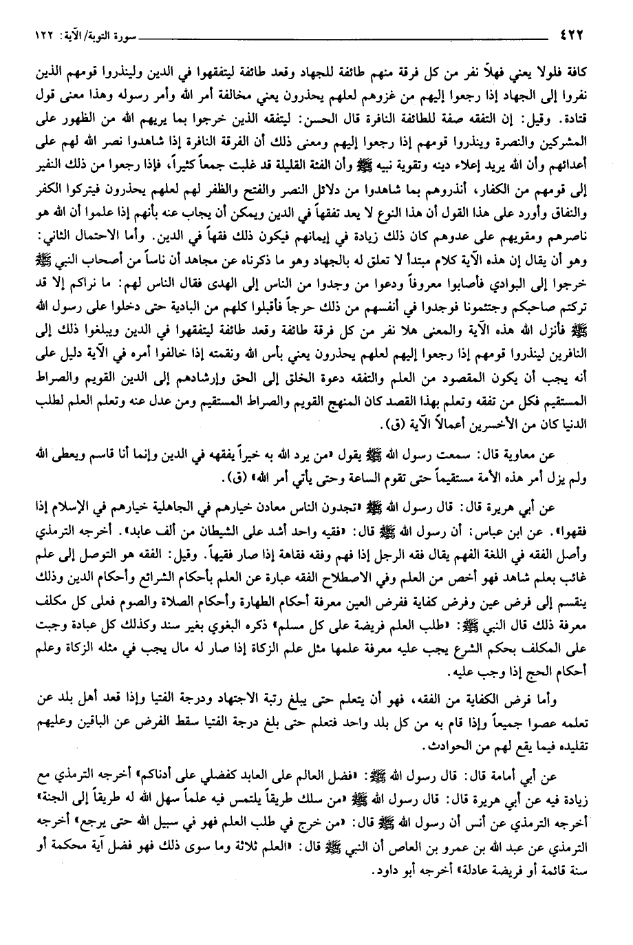 عن أبي هريرة قال: قال رسول الله صلى الله عليه وسلم «تجدون الناس معادن خيارهم في الجاهلية خيارهم في الإسلام إذا فقهوا». عن ابن عباس: أن رسول الله صلى الله عليه وسلم قال: «فقيه واحد أشد على الشيطان من ألف عابد». أخرجه الترمذي وأصل الفقه في اللغة الفهم يقال فقه الرجل إذا فهم وفقه فقاهة إذا صار فقيها. وقيل: الفقه هو التوصل إلى علم غائب بعلم شاهد فهو أخص من العلم وفي الاصطلاح الفقه عبارة عن العلم بأحكام الشرائع وأحكام الدين وذلك ينقسم إلى فرض عين وفرض كفاية ففرض العين معرفة أحكام الطهارة وأحكام الصلاة والصوم فعلى كل مكلف معرفة ذلك قال النبي صلى الله عليه وسلم: «طلب العلم فريضة على كل مسلم» ذكره البغوي بغير سند وكذلك كل عبادة وجبت على المكلف بحكم الشرع يجب عليه معرفة علمها مثل علم الزكاة إذا صار له مال يجب في مثله الزكاة وعلم أحكام الحج إذا وجب عليه.