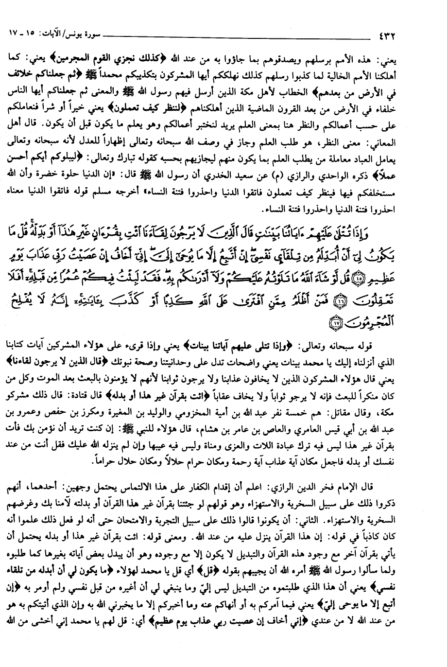 وَإِذا تُتْلى عَلَيْهِمْ آياتُنا بَيِّناتٍ قالَ الَّذِينَ لا يَرْجُونَ لِقاءَنَا ائْتِ بِقُرْآنٍ غَيْرِ هذا أَوْ بَدِّلْهُ قُلْ ما يَكُونُ لِي أَنْ أُبَدِّلَهُ مِنْ تِلْقاءِ نَفْسِي إِنْ أَتَّبِعُ إِلاَّ ما يُوحى إِلَيَّ إِنِّي أَخافُ إِنْ عَصَيْتُ رَبِّي عَذابَ يَوْمٍ عَظِيمٍ (15) قُلْ لَوْ شاءَ اللَّهُ ما تَلَوْتُهُ عَلَيْكُمْ وَلا أَدْراكُمْ بِهِ فَقَدْ لَبِثْتُ فِيكُمْ عُمُراً مِنْ قَبْلِهِ أَفَلا تَعْقِلُونَ (16) فَمَنْ أَظْلَمُ مِمَّنِ افْتَرى عَلَى اللَّهِ كَذِباً أَوْ كَذَّبَ بِآياتِهِ إِنَّهُ لا يُفْلِحُ الْمُجْرِمُونَ (17)