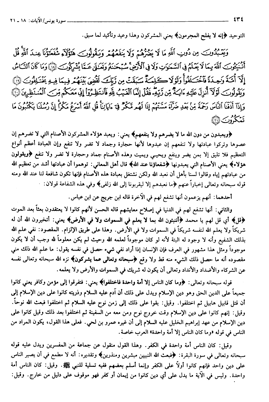 وَيَعْبُدُونَ مِنْ دُونِ اللَّهِ ما لا يَضُرُّهُمْ وَلا يَنْفَعُهُمْ وَيَقُولُونَ هؤُلاءِ شُفَعاؤُنا عِنْدَ اللَّهِ قُلْ أَتُنَبِّئُونَ اللَّهَ بِما لا يَعْلَمُ فِي السَّماواتِ وَلا فِي الْأَرْضِ سُبْحانَهُ وَتَعالى عَمَّا يُشْرِكُونَ (18) وَما كانَ النَّاسُ إِلاَّ أُمَّةً واحِدَةً فَاخْتَلَفُوا وَلَوْلا كَلِمَةٌ سَبَقَتْ مِنْ رَبِّكَ لَقُضِيَ بَيْنَهُمْ فِيما فِيهِ يَخْتَلِفُونَ (19) وَيَقُولُونَ لَوْلا أُنْزِلَ عَلَيْهِ آيَةٌ مِنْ رَبِّهِ فَقُلْ إِنَّمَا الْغَيْبُ لِلَّهِ فَانْتَظِرُوا إِنِّي مَعَكُمْ مِنَ الْمُنْتَظِرِينَ (20) وَإِذا أَذَقْنَا النَّاسَ رَحْمَةً مِنْ بَعْدِ ضَرَّاءَ مَسَّتْهُمْ إِذا لَهُمْ مَكْرٌ فِي آياتِنا قُلِ اللَّهُ أَسْرَعُ مَكْراً إِنَّ رُسُلَنا يَكْتُبُونَ ما تَمْكُرُونَ (21)