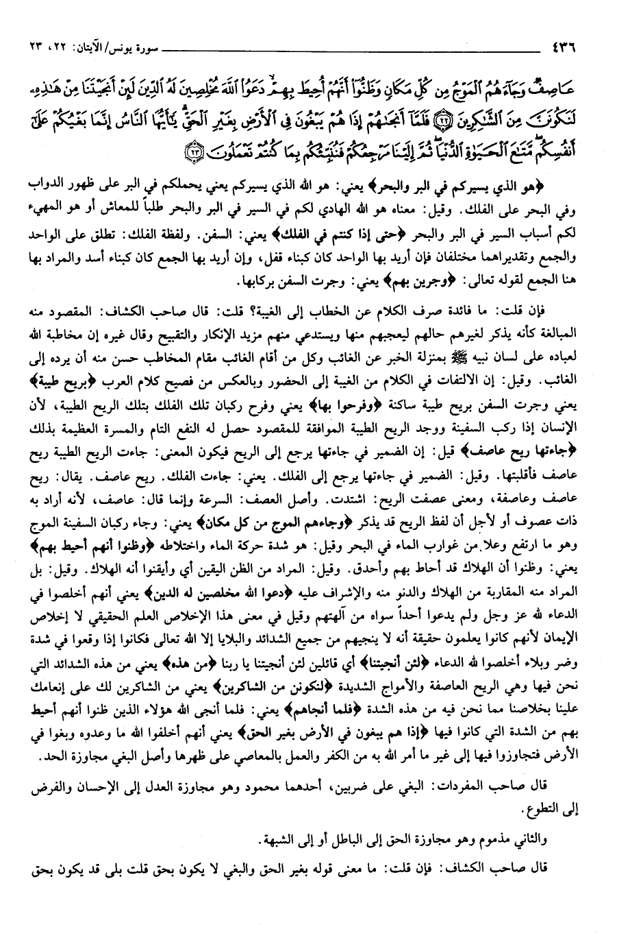 فإن قلت: ما فائدة صرف الكلام عن الخطاب إلى الغيبة؟ قلت: قال صاحب الكشاف: المقصود منه المبالغة كأنه يذكر لغيرهم حالهم ليعجبهم منها ويستدعي منهم مزيد الإنكار والتقبيح وقال غيره إن مخاطبة الله لعباده على لسان نبيه صلى الله عليه وسلم بمنزلة الخبر عن الغائب وكل من أقام الغائب مقام المخاطب حسن منه أن يرده إلى الغائب. وقيل: إن الالتفات في الكلام من الغيبة إلى الحضور وبالعكس من فصيح كلام العرب بِرِيحٍ طَيِّبَةٍ يعني وجرت السفن بريح طيبة ساكنة وَفَرِحُوا بِها يعني وفرح ركبان تلك الفلك بتلك الريح الطيبة، لأن الإنسان إذا ركب السفينة ووجد الريح الطيبة الموافقة للمقصود حصل له النفع التام والمسرة العظيمة بذلك جاءَتْها رِيحٌ عاصِفٌ قيل: إن الضمير في جاءتها يرجع إلى الريح فيكون المعنى: جاءت الريح الطيبة ريح عاصف فأقلبتها. وقيل: الضمير في جاءتها يرجع إلى الفلك. يعني: جاءت الفلك. ريح عاصف. يقال: ريح عاصف وعاصفة، ومعنى عصفت الريح: اشتدت. وأصل العصف: السرعة وإنما قال: عاصف، لأنه أراد به ذات عصوف أو لأجل أن لفظ الريح قد يذكر وَجاءَهُمُ الْمَوْجُ مِنْ كُلِّ مَكانٍ يعني: وجاء ركبان السفينة الموج وهو ما ارتفع وعلا من غوارب الماء في البحر وقيل: هو شدة حركة الماء واختلاطه وَظَنُّوا أَنَّهُمْ أُحِيطَ بِهِمْ يعني: وظنوا أن الهلاك قد أحاط بهم وأحدق. وقيل: المراد من الظن اليقين أي وأيقنوا أنه الهلاك. وقيل: بل المراد منه المقاربة من الهلاك والدنو منه والإشراف عليه دَعَوُا اللَّهَ مُخْلِصِينَ لَهُ الدِّينَ يعني أنهم أخلصوا في الدعاء لله عز وجل ولم يدعوا أحدا سواه من آلهتهم وقيل في معنى هذا الإخلاص العلم الحقيقي لا إخلاص الإيمان لأنهم كانوا يعلمون حقيقة أنه لا ينجيهم من جميع الشدائد والبلايا إلا الله تعالى فكانوا إذا وقعوا في شدة وضر وبلاء أخلصوا لله الدعاء لَئِنْ أَنْجَيْتَنا أي قائلين لئن أنجيتنا يا ربنا مِنْ هذِهِ يعني من هذه الشدائد التي نحن فيها وهي الريح العاصفة والأمواج الشديدة لَنَكُونَنَّ مِنَ الشَّاكِرِينَ يعني من الشاكرين لك على إنعامك علينا بخلاصنا مما نحن فيه من هذه الشدة فَلَمَّا أَنْجاهُمْ يعني: فلما أنجى الله هؤلاء الذين ظنوا أنهم أحيط بهم من الشدة التي كانوا فيها إِذا هُمْ يَبْغُونَ فِي الْأَرْضِ بِغَيْرِ الْحَقِّ يعني أنهم أخلفوا الله ما وعدوه وبغوا في الأرض فتجاوزوا فيها إلى غير ما أمر الله به من الكفر والعمل بالمعاصي على ظهرها وأصل البغي مجاوزة الحد.
