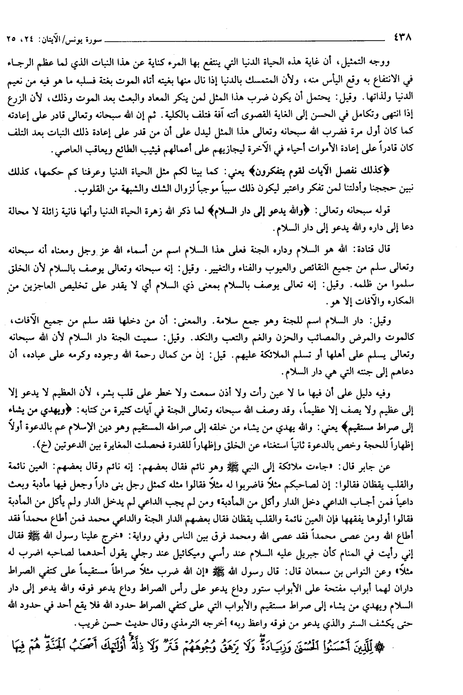 وفيه دليل على أن فيها ما لا عين رأت ولا أذن سمعت ولا خطر على قلب بشر، لأن العظيم لا يدعو إلا إلى عظيم ولا يصف إلا عظيما، وقد وصف الله سبحانه وتعالى الجنة في آيات كثيرة من كتابه: وَيَهْدِي مَنْ يَشاءُ إِلى صِراطٍ مُسْتَقِيمٍ يعني: والله يهدي من يشاء من خلقه إلى صراطه المستقيم وهو دين الإسلام عم بالدعوة أولا إظهارا للحجة وخص بالدعوة ثانيا استغناء عن الخلق وإظهارا للقدرة فحصلت المغايرة بين الدعوتين (خ).