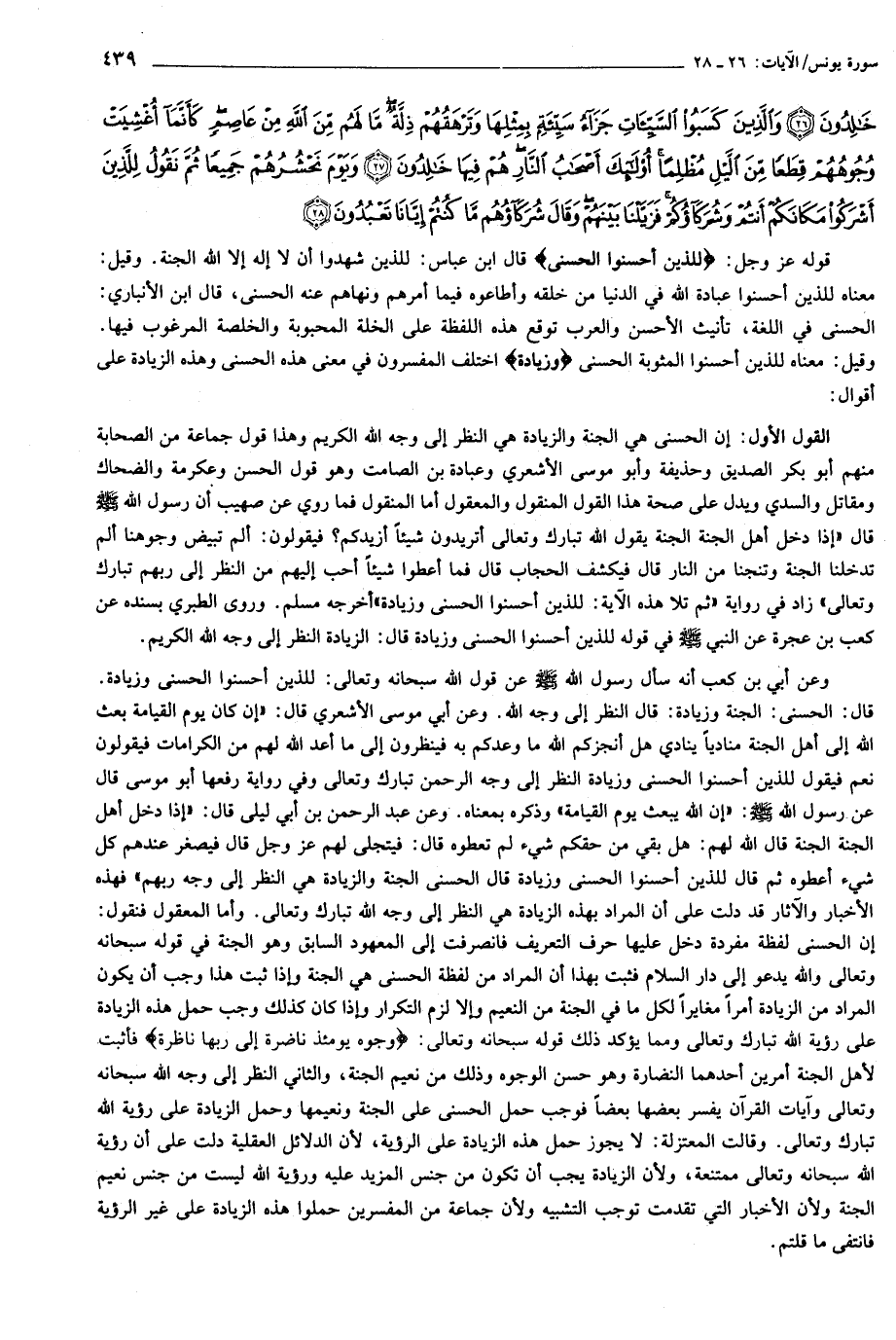 قال: الحسنى: الجنة وزيادة: قال النظر إلى وجه الله. وعن أبي موسى الأشعري قال: «إن كان يوم القيامة بعث الله إلى أهل الجنة مناديا ينادي هل أنجزكم الله ما وعدكم به فينظرون إلى ما أعد الله لهم من الكرامات فيقولون نعم فيقول للذين أحسنوا الحسنى وزيادة النظر إلى وجه الرحمن تبارك وتعالى وفي رواية رفعها أبو موسى قال عن رسول الله صلى الله عليه وسلم: «إن الله يبعث يوم القيامة» وذكره بمعناه. وعن عبد الرحمن بن أبي ليلى قال: «إذا دخل أهل الجنة الجنة قال الله لهم: هل بقي من حقكم شيء لم تعطوه قال: فيتجلى لهم عز وجل قال فيصغر عندهم كل شيء أعطوه ثم قال للذين أحسنوا الحسنى وزيادة قال الحسنى الجنة والزيادة هي النظر إلى وجه ربهم» فهذه الأخبار والآثار قد دلت على أن المراد بهذه الزيادة هي النظر إلى وجه الله تبارك وتعالى. وأما المعقول فنقول: