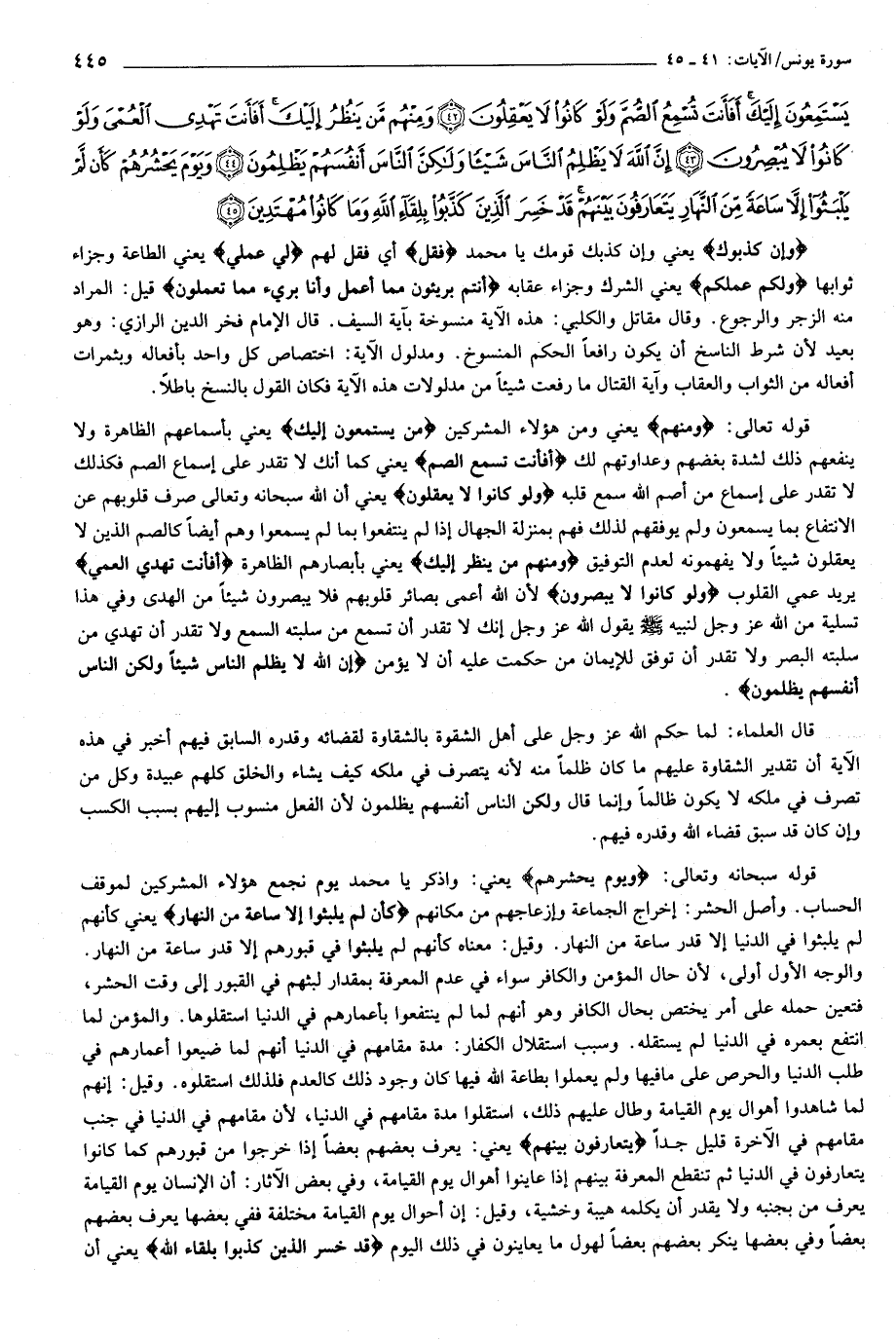 وَإِنْ كَذَّبُوكَ فَقُلْ لِي عَمَلِي وَلَكُمْ عَمَلُكُمْ أَنْتُمْ بَرِيئُونَ مِمَّا أَعْمَلُ وَأَنَا بَرِيءٌ مِمَّا تَعْمَلُونَ (41) وَمِنْهُمْ مَنْ يَسْتَمِعُونَ إِلَيْكَ أَفَأَنْتَ تُسْمِعُ الصُّمَّ وَلَوْ كانُوا لا يَعْقِلُونَ (42) وَمِنْهُمْ مَنْ يَنْظُرُ إِلَيْكَ أَفَأَنْتَ تَهْدِي الْعُمْيَ وَلَوْ كانُوا لا يُبْصِرُونَ (43) إِنَّ اللَّهَ لا يَظْلِمُ النَّاسَ شَيْئاً وَلكِنَّ النَّاسَ أَنْفُسَهُمْ يَظْلِمُونَ (44) وَيَوْمَ يَحْشُرُهُمْ كَأَنْ لَمْ يَلْبَثُوا إِلاَّ ساعَةً مِنَ النَّهارِ يَتَعارَفُونَ بَيْنَهُمْ قَدْ خَسِرَ الَّذِينَ كَذَّبُوا بِلِقاءِ اللَّهِ وَما كانُوا مُهْتَدِينَ (45)