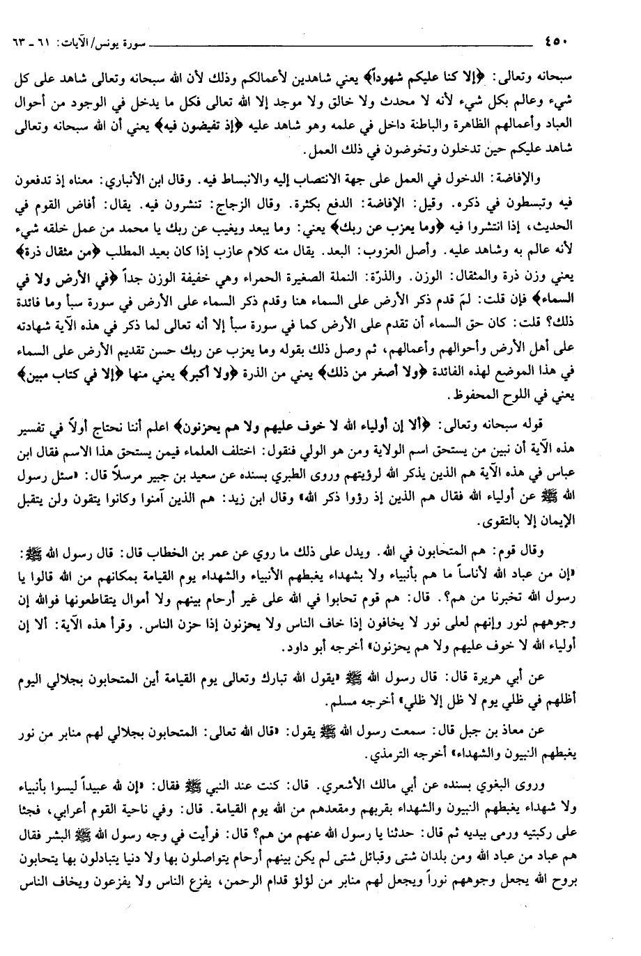 قوله سبحانه وتعالى: أَلا إِنَّ أَوْلِياءَ اللَّهِ لا خَوْفٌ عَلَيْهِمْ وَلا هُمْ يَحْزَنُونَ اعلم أننا نحتاج أولا في تفسير هذه الآية أن نبين من يستحق اسم الولاية ومن هو الولي فنقول: اختلف العلماء فيمن يستحق هذا الاسم فقال ابن عباس في هذه الآية هم الذين يذكر الله لرؤيتهم وروى الطبري بسنده عن سعيد بن جبير مرسلا قال: «سئل رسول الله صلى الله عليه وسلم عن أولياء الله فقال هم الذين إذ رأوا ذكر الله» وقال ابن زيد: هم الذين آمنوا وكانوا يتقون ولن يتقبل الإيمان إلا بالتقوى.