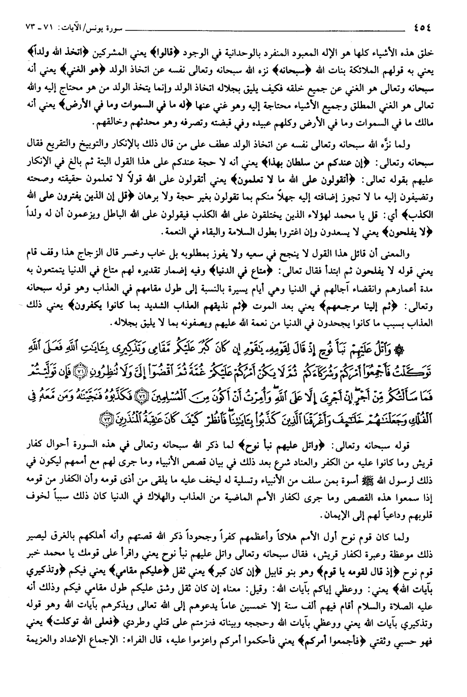 وَاتْلُ عَلَيْهِمْ نَبَأَ نُوحٍ إِذْ قالَ لِقَوْمِهِ يا قَوْمِ إِنْ كانَ كَبُرَ عَلَيْكُمْ مَقامِي وَتَذْكِيرِي بِآياتِ اللَّهِ فَعَلَى اللَّهِ تَوَكَّلْتُ فَأَجْمِعُوا أَمْرَكُمْ وَشُرَكاءَكُمْ ثُمَّ لا يَكُنْ أَمْرُكُمْ عَلَيْكُمْ غُمَّةً ثُمَّ اقْضُوا إِلَيَّ وَلا تُنْظِرُونِ (71) فَإِنْ تَوَلَّيْتُمْ فَما سَأَلْتُكُمْ مِنْ أَجْرٍ إِنْ أَجْرِيَ إِلاَّ عَلَى اللَّهِ وَأُمِرْتُ أَنْ أَكُونَ مِنَ الْمُسْلِمِينَ (72) فَكَذَّبُوهُ فَنَجَّيْناهُ وَمَنْ مَعَهُ فِي الْفُلْكِ وَجَعَلْناهُمْ خَلائِفَ وَأَغْرَقْنَا الَّذِينَ كَذَّبُوا بِآياتِنا فَانْظُرْ كَيْفَ كانَ عاقِبَةُ الْمُنْذَرِينَ (73)