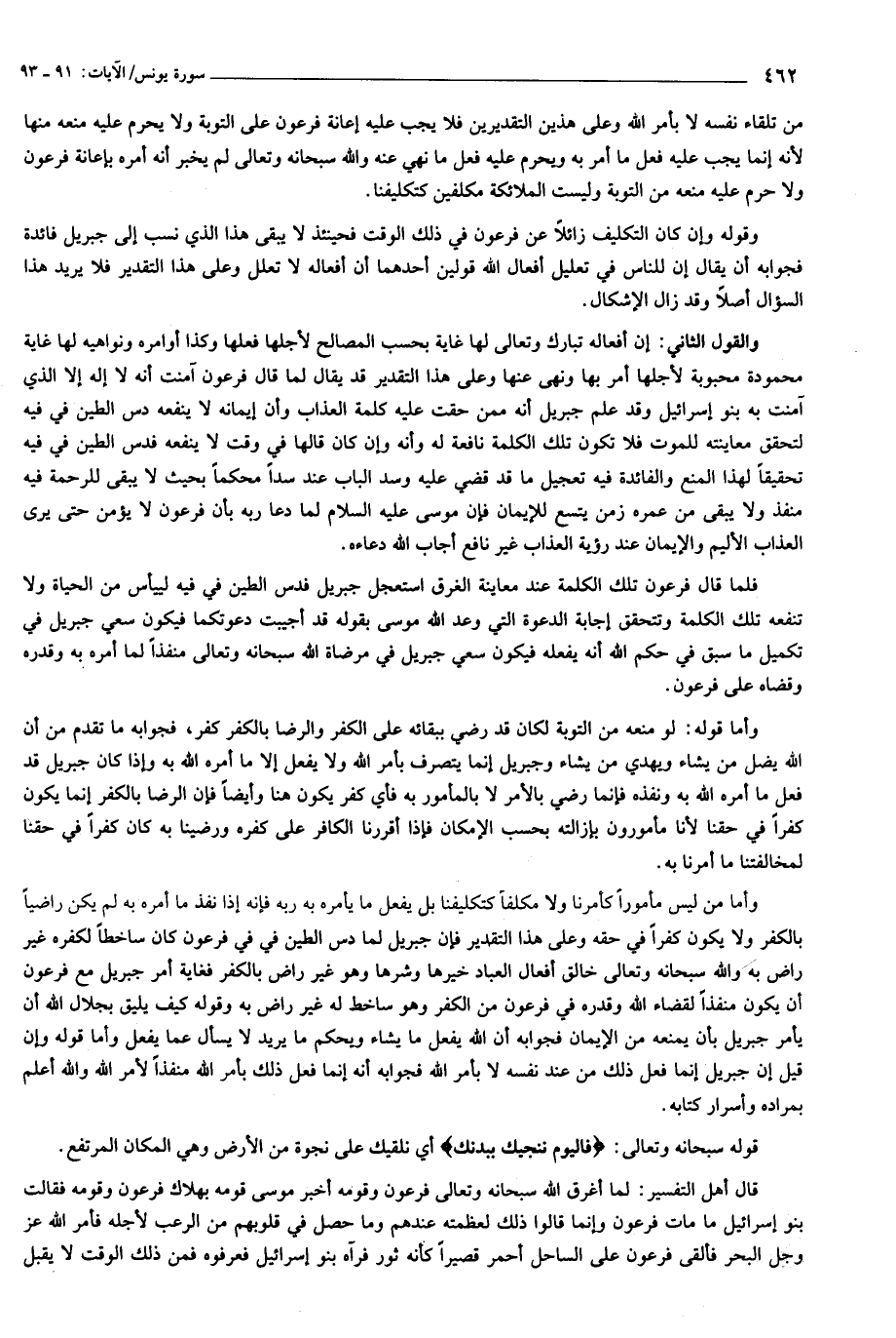 وقوله وإن كان التكليف زائلا عن فرعون في ذلك الوقت فحينئذ لا يبقى هذا الذي نسب إلى جبريل فائدة فجوابه أن يقال إن للناس في تعليل أفعال الله قولين أحدهما أن أفعاله لا تعلل وعلى هذا التقدير فلا يريد هذا السؤال أصلا وقد زال الإشكال.