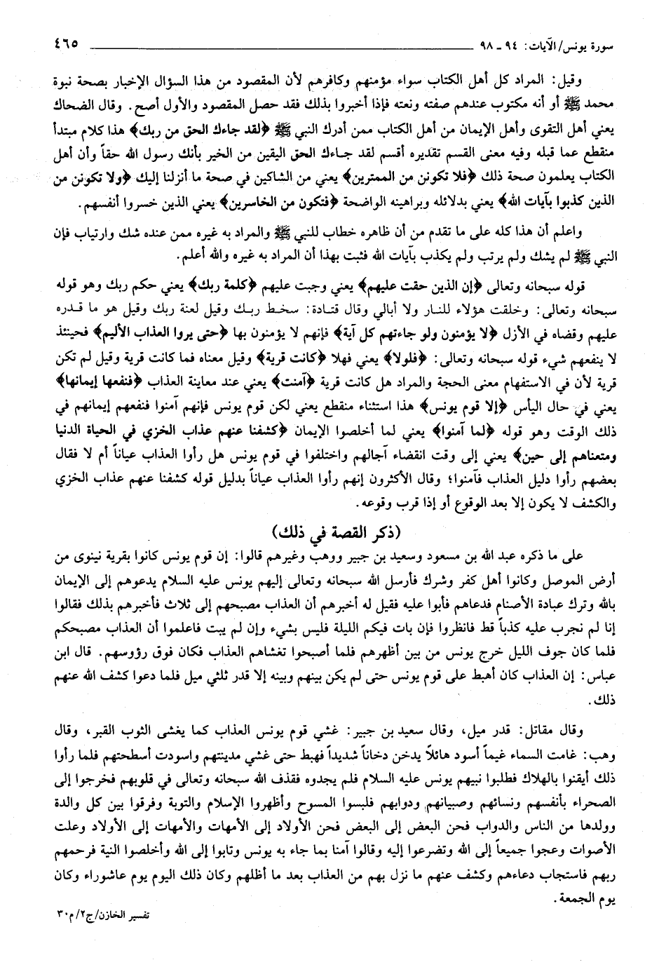 ((ذكر القصة في ذلك)) على ما ذكره عبد الله بن مسعود وسعيد بن جبير ووهب وغيرهم قالوا: إن قوم يونس كانوا بقرية نينوى من أرض الموصل وكانوا أهل كفر وشرك فأرسل الله سبحانه وتعالى إليهم يونس عليه السلام يدعوهم إلى الإيمان بالله وترك عبادة الأصنام فدعاهم فأبوا عليه فقيل له أخبرهم أن العذاب مصبحهم إلى ثلاث فأخبرهم بذلك فقالوا إنا لم نجرب عليه كذبا قط فانظروا فإن بات فيكم الليلة فليس بشيء وإن لم يبت فاعلموا أن العذاب مصبحكم فلما كان جوف الليل خرج يونس من بين أظهرهم فلما أصبحوا تغشاهم العذاب فكان فوق رؤوسهم. قال ابن عباس: إن العذاب كان أهبط على قوم يونس حتى لم يكن بينهم وبينه إلا قدر ثلثي ميل فلما دعوا كشف الله عنهم ذلك.
