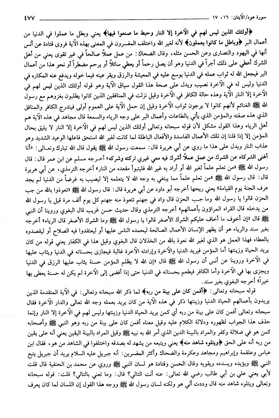 أُولئِكَ الَّذِينَ لَيْسَ لَهُمْ فِي الْآخِرَةِ إِلَّا النَّارُ وَحَبِطَ ما صَنَعُوا فِيها يعني وبطل ما عملوا في الدنيا من أعمال البر وَباطِلٌ ما كانُوا يَعْمَلُونَ لأنه لغير الله واختلف المفسرون في المعنى بهذه الآية فروى قتادة عن أنس أنها في اليهود والنصارى وعن الحسن مثله، وقال الضحاك: من عمل عملا صالحا في غير تقوى يعني من أهل الشرك أعطي على ذلك أجرا في الدنيا وهو أن يصل رحما أو يعطي سائلا أو يرحم مضطرا أو نحو هذا من أعمال البر فيجعل الله له ثواب عمله في الدنيا يوسع عليه في المعيشة والرزق ويقر عينه فيما خوله ويدفع عنه المكاره في الدنيا وليس له في الآخرة نصيب ويدل على صحة هذا القول سياق الآية وهو قوله أولئك الذين ليس لهم في الآخرة إلا النار الآية وهذه حالة الكافر في الآخرة وقيل نزلت في المنافقين الذين كانوا يطلبون بغزوهم مع رسول الله صلى الله عليه وسلم الغنائم لأنهم كانوا لا يرجون ثواب الآخرة وقيل إن حمل الآية على العموم أولى فيندرج الكافر والمنافق الذي هذه صفته والمؤمن الذي يأتي بالطاعات وأعمال البر على وجه الرياء والسمعة قال مجاهد في هذه الآية هم أهل الرياء وهذا القول مشكل لأن قوله سبحانه وتعالى أولئك الذين ليس لهم في الآخرة إلا النار لا يليق بحال المؤمن إلا إذا قلنا إن تلك الأعمال الفاسدة والأفعال الباطلة لما كانت لغير الله استحق فاعلها الوعيد الشديد وهو عذاب النار ويدل على هذا ما روي عن أبي هريرة قال: سمعت رسول الله صلى الله عليه وسلم يقول قال الله تبارك وتعالى: أنا أغنى الشركاء عن الشرك من عمل عملا أشرك فيه معي غيري تركته وشركه أخرجه مسلم عن ابن عمر قال: قال رسول الله صلى الله عليه وسلم «من تعلم علما لغير الله أو أراد به غير الله فليتبوأ مقعده من النار» أخرجه الترمذي، عن أبي هريرة قال: قال رسول الله صلى الله عليه وسلم «من تعلم علما مما يبتغي به وجه الله لا يتعلمه إلا ليصيب به غرضا من الدنيا لم يجد عرف الجنة يوم القيامة» يعني ريحها أخرجه أبو داود عن أبي هريرة قال: قال رسول الله صلى الله عليه وسلم «تعوذوا بالله من جب الحزن قالوا يا رسول الله وما جب الحزن قال واد في جهنم تتعوذ منه جهنم كل يوم ألف مرة قيل يا رسول الله من يدخله قال القراء المراؤون بأعمالهم» أخرجه الترمذي وقال حديث حسن غريب قال البغوي وروينا أن النبي صلى الله عليه وسلم قال «إن أخوف ما أخاف عليكم الشرك الأصغر قالوا يا رسول الله صلى الله عليه وسلم وما الشرك الأصغر قال الرياء» أخرجه بغير سند والرياء هو أن يظهر الإنسان الأعمال الصالحة ليحمده الناس عليها أو ليعتقدوا فيه الصلاح أو ليقصدوه بالعطاء فهذا العمل هو الذي لغير الله نعوذ بالله من الخذلان قال البغوي وقيل هذا في الكفار يعني قوله من كان يريد الحياة وزينتها أما المؤمن فيريد الدنيا والآخرة وإرادته الآخرة غالبة فيجازى بحسناته في الدنيا ويثاب عليها في الآخرة وروينا عن أنس أن رسول الله صلى الله عليه وسلم قال «إن الله لا يظلم المؤمن حسنة يثاب عليها الرزق في الدنيا ويجزى بها في الآخرة وأما الكافر فيطعم بحسناته في الدنيا حتى إذا أفضى إلى الآخرة لم يكن له حسنة يعطى بها خيرا» أخرجه البغوي بغير سند.