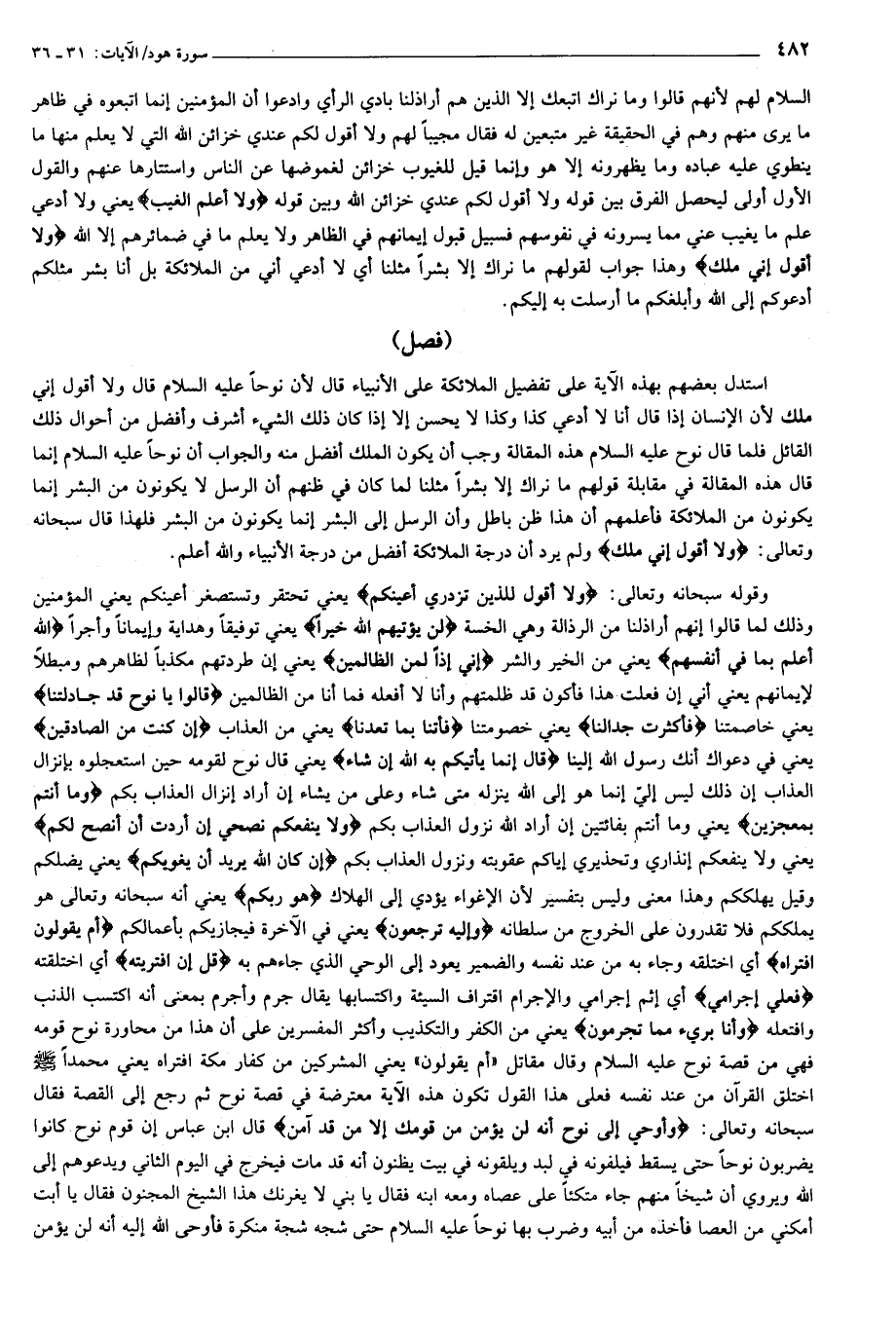 ((فصل)) استدل بعضهم بهذه الآية على تفضيل الملائكة على الأنبياء قال لأن نوحا عليه السلام قال ولا أقول إني ملك لأن الإنسان إذا قال أنا لا أدعي كذا وكذا لا يحسن إلا إذا كان ذلك الشيء أشرف وأفضل من أحوال ذلك القائل فلما قال نوح عليه السلام هذه المقالة وجب أن يكون الملك أفضل منه والجواب أن نوحا عليه السلام إنما قال هذه المقالة في مقابلة قولهم ما نراك إلا بشرا مثلنا لما كان في ظنهم أن الرسل لا يكونون من البشر إنما يكونون من الملائكة فأعلمهم أن هذا ظن باطل وأن الرسل إلى البشر إنما يكونون من البشر فلهذا قال سبحانه وتعالى: وَلا أَقُولُ إِنِّي مَلَكٌ ولم يرد أن درجة الملائكة أفضل من درجة الأنبياء والله أعلم.