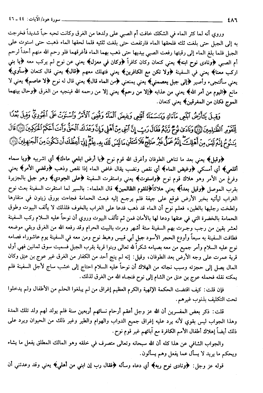 وَقِيلَ يا أَرْضُ ابْلَعِي ماءَكِ وَيا سَماءُ أَقْلِعِي وَغِيضَ الْماءُ وَقُضِيَ الْأَمْرُ وَاسْتَوَتْ عَلَى الْجُودِيِّ وَقِيلَ بُعْداً لِلْقَوْمِ الظَّالِمِينَ (44) وَنادى نُوحٌ رَبَّهُ فَقالَ رَبِّ إِنَّ ابْنِي مِنْ أَهْلِي وَإِنَّ وَعْدَكَ الْحَقُّ وَأَنْتَ أَحْكَمُ الْحاكِمِينَ (45) قالَ يا نُوحُ إِنَّهُ لَيْسَ مِنْ أَهْلِكَ إِنَّهُ عَمَلٌ غَيْرُ صالِحٍ فَلا تَسْئَلْنِ ما لَيْسَ لَكَ بِهِ عِلْمٌ إِنِّي أَعِظُكَ أَنْ تَكُونَ مِنَ الْجاهِلِينَ (46)
