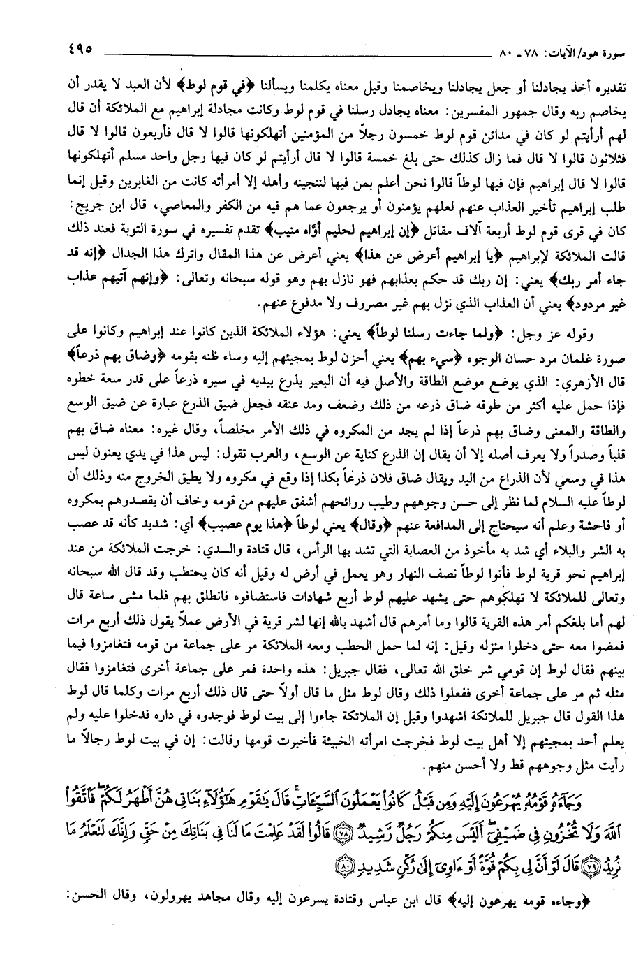 وَجاءَهُ قَوْمُهُ يُهْرَعُونَ إِلَيْهِ وَمِنْ قَبْلُ كانُوا يَعْمَلُونَ السَّيِّئاتِ قالَ يا قَوْمِ هؤُلاءِ بَناتِي هُنَّ أَطْهَرُ لَكُمْ فَاتَّقُوا اللَّهَ وَلا تُخْزُونِ فِي ضَيْفِي أَلَيْسَ مِنْكُمْ رَجُلٌ رَشِيدٌ (78) قالُوا لَقَدْ عَلِمْتَ ما لَنا فِي بَناتِكَ مِنْ حَقٍّ وَإِنَّكَ لَتَعْلَمُ ما نُرِيدُ (79) قالَ لَوْ أَنَّ لِي بِكُمْ قُوَّةً أَوْ آوِي إِلى رُكْنٍ شَدِيدٍ (80)