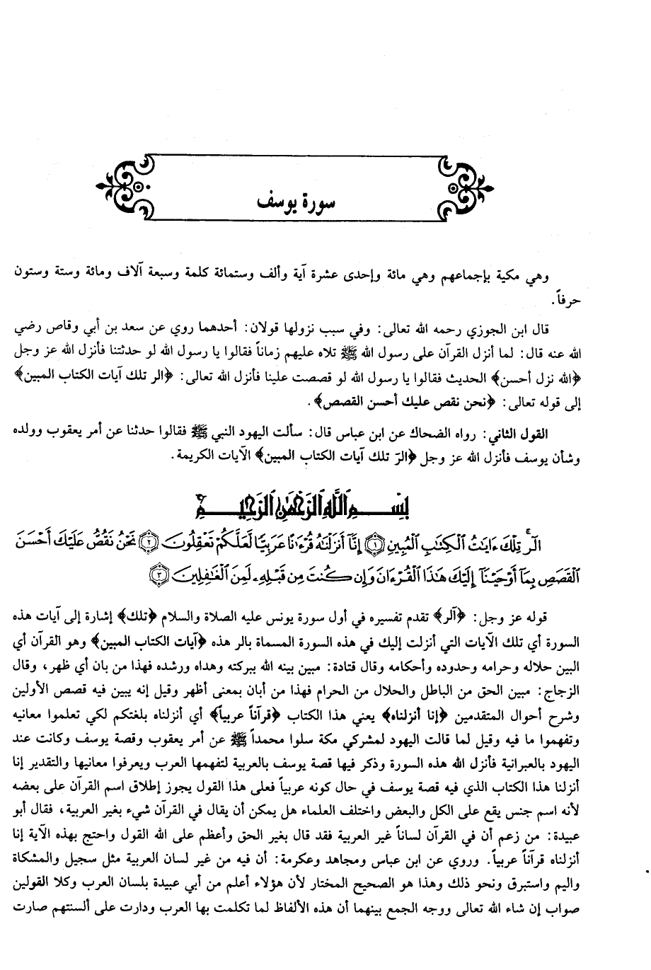الر تِلْكَ آياتُ الْكِتابِ الْمُبِينِ (1) إِنَّا أَنْزَلْناهُ قُرْآناً عَرَبِيًّا لَعَلَّكُمْ تَعْقِلُونَ (2) نَحْنُ نَقُصُّ عَلَيْكَ أَحْسَنَ الْقَصَصِ بِما أَوْحَيْنا إِلَيْكَ هذَا الْقُرْآنَ وَإِنْ كُنْتَ مِنْ قَبْلِهِ لَمِنَ الْغافِلِينَ (3)