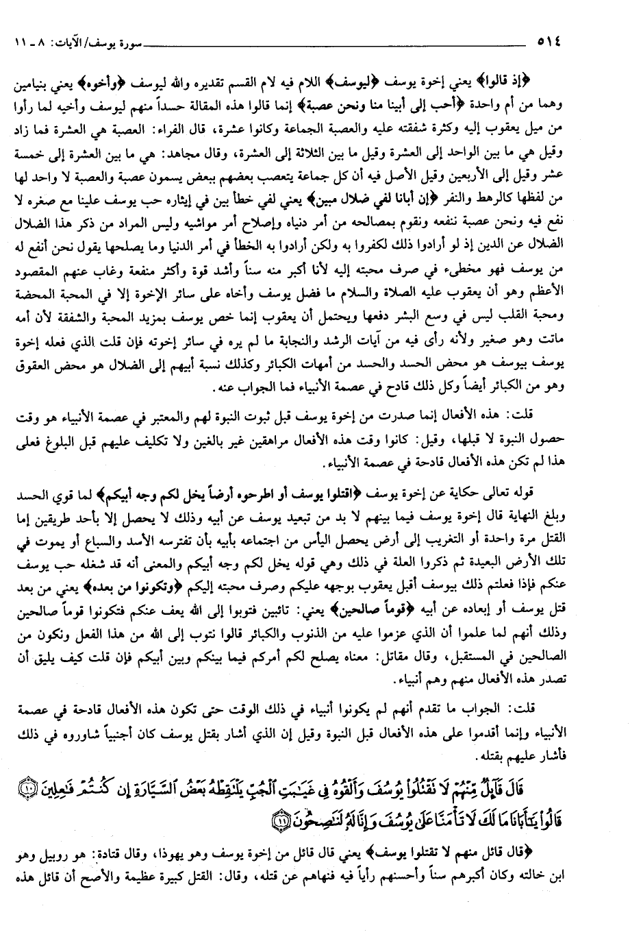 إِذْ قالُوا يعني إخوة يوسف لَيُوسُفُ اللام فيه لام القسم تقديره والله ليوسف وَأَخُوهُ يعني بنيامين وهما من أم واحدة أَحَبُّ إِلى أَبِينا مِنَّا وَنَحْنُ عُصْبَةٌ إنما قالوا هذه المقالة حسدا منهم ليوسف وأخيه لما رأوا من ميل يعقوب إليه وكثرة شفقته عليه والعصبة الجماعة وكانوا عشرة، قال الفراء: العصبة هي العشرة فما زاد وقيل هي ما بين الواحد إلى العشرة وقيل ما بين الثلاثة إلى العشرة، وقال مجاهد: هي ما بين العشرة إلى خمسة عشر وقيل إلى الأربعين وقيل الأصل فيه أن كل جماعة يتعصب بعضهم ببعض يسمون عصبة والعصبة لا واحد لها من لفظها كالرهط والنفر إِنَّ أَبانا لَفِي ضَلالٍ مُبِينٍ يعني لفي خطأ بين في إيثاره حب يوسف علينا مع صغره لا نفع فيه ونحن عصبة ننفعه ونقوم بمصالحه من أمر دنياه وإصلاح أمر مواشيه وليس المراد من ذكر هذا الضلال الضلال عن الدين إذ لو أرادوا ذلك لكفروا به ولكن أرادوا به الخطأ في أمر الدنيا وما يصلحها يقول نحن أنفع له من يوسف فهو مخطئ في صرف محبته إليه لأنا أكبر منه سنا وأشد قوة وأكثر منفعة وغاب عنهم المقصود الأعظم وهو أن يعقوب عليه الصلاة والسلام ما فضل يوسف وأخاه على سائر الإخوة إلا في المحبة المحضة ومحبة القلب ليس في وسع البشر دفعها ويحتمل أن يعقوب إنما خص يوسف بمزيد المحبة والشفقة لأن أمه ماتت وهو صغير ولأنه رأى فيه من آيات الرشد والنجابة ما لم يره في سائر إخوته فإن قلت الذي فعله إخوة يوسف بيوسف هو محض الحسد والحسد من أمهات الكبائر وكذلك نسبة أبيهم إلى الضلال هو محض العقوق وهو من الكبائر أيضا وكل ذلك قادح في عصمة الأنبياء فما الجواب عنه.