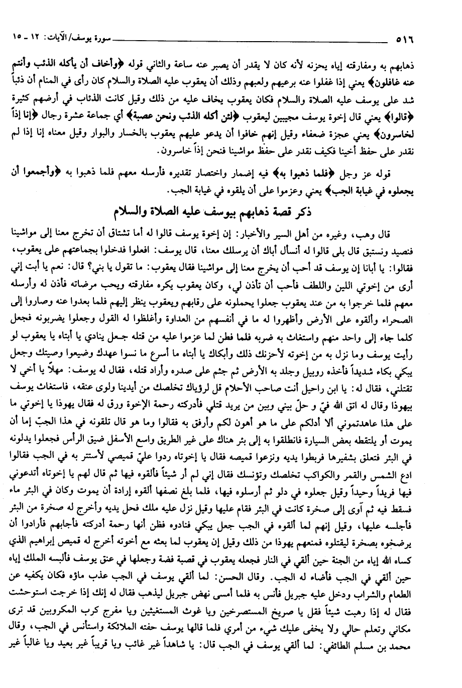 (ذكر قصة ذهابهم بيوسف عليه الصلاة والسلام) قال وهب، وغيره من أهل السير والأخبار: إن إخوة يوسف قالوا له أما تشتاق أن تخرج معنا إلى مواشينا فنصيد ونستبق قال بلى قالوا له أنسأل أباك أن يرسلك معنا، قال يوسف: افعلوا فدخلوا بجماعتهم على يعقوب، فقالوا: يا أبانا إن يوسف قد أحب أن يخرج معنا إلى مواشينا فقال يعقوب: ما تقول يا بني؟ قال: نعم يا أبت إني أرى من إخوتي اللين واللطف فأحب أن تأذن لي، وكان يعقوب يكره مفارقته ويحب مرضاته فأذن له وأرسله معهم فلما خرجوا به من عند يعقوب جعلوا يحملونه على رقابهم ويعقوب ينظر إليهم فلما بعدوا عنه وصاروا إلى الصحراء وألقوه على الأرض وأظهروا له ما في أنفسهم من العداوة وأغلظوا له القول وجعلوا يضربونه فجعل كلما جاء إلى واحد منهم واستغاث به ضربه فلما فطن لما عزموا عليه من قتله جعل ينادي يا أبتاه يا يعقوب لو رأيت يوسف وما نزل به من إخوته لأحزنك ذلك وأبكاك يا أبتاه ما أسرع ما نسوا عهدك وضيعوا وصيتك وجعل يبكي بكاء شديدا فأخذه روبيل وجلد به الأرض ثم جثم على صدره وأراد قتله، فقال له يوسف: مهلا يا أخي لا تقتلني، فقال له: يا ابن راحيل أنت صاحب الأحلام قل لرؤياك تخلصك من أيدينا ولوى عنقه، فاستغاث يوسف بيهوذا وقال له اتق الله فيّ وحلّ بيني وبين من يريد قتلي فأدركته رحمة الإخوة ورق له فقال يهوذا يا إخوتي ما على هذا عاهدتموني ألا أدلكم على ما هو أهون لكم وأرفق به فقالوا وما هو قال تلقونه في هذا الجبّ إما أن يموت أو يلتقطه بعض السيارة فانطلقوا به إلى بئر هناك على غير الطريق واسع الأسفل ضيق الرأس فجعلوا يدلونه في البئر فتعلق بشفيرها فربطوا يديه ونزعوا قميصه فقال يا إخوتاه ردوا عليّ قميصي لأستتر به في الجب فقالوا ادع الشمس والقمر والكواكب تخلصك وتؤنسك فقال إني لم أر شيئا فألقوه فيها ثم قال لهم يا إخوتاه أتدعوني فيها فريدا وحيدا وقيل جعلوه في دلو ثم أرسلوه فيها، فلما بلغ نصفها ألقوه إرادة أن يموت وكان في البئر ماء فسقط فيه ثم آوى إلى صخرة كانت في البئر فقام عليها وقيل نزل عليه ملك فحل يديه وأخرج له صخرة من البئر فأجلسه عليها، وقيل إنهم لما ألقوه في الجب جعل يبكي فنادوه فظن أنها رحمة أدركته فأجابهم فأرادوا أن يرضخوه بصخرة ليقتلوه فمنعهم يهوذا من ذلك وقيل إن يعقوب لما بعثه مع أخوته أخرج له قميص إبراهيم الذي كساه الله إياه من الجنة حين ألقي في النار فجعله يعقوب في قصبة فضة وجعلها في عنق يوسف فألبسه الملك إياه حين ألقي في الجب فأضاء له الجب. وقال الحسن: لما ألقي يوسف في الجب عذب ماؤه فكان يكفيه عن الطعام والشراب ودخل عليه جبريل فأنس به فلما أمسى نهض جبريل ليذهب فقال له إنك إذا خرجت استوحشت فقال له إذا رهبت شيئا فقل يا صريخ المستصرخين ويا غوث المستغيثين ويا مفرج كرب المكروبين قد ترى مكاني وتعلم حالي ولا يخفى عليك شيء من أمري فلما قالها يوسف حفته الملائكة واستأنس في الجب، وقال محمد بن مسلم الطائفي: لما ألقي يوسف في الجب قال: يا شاهدا غير غائب ويا قريبا غير بعيد ويا غالبا غير