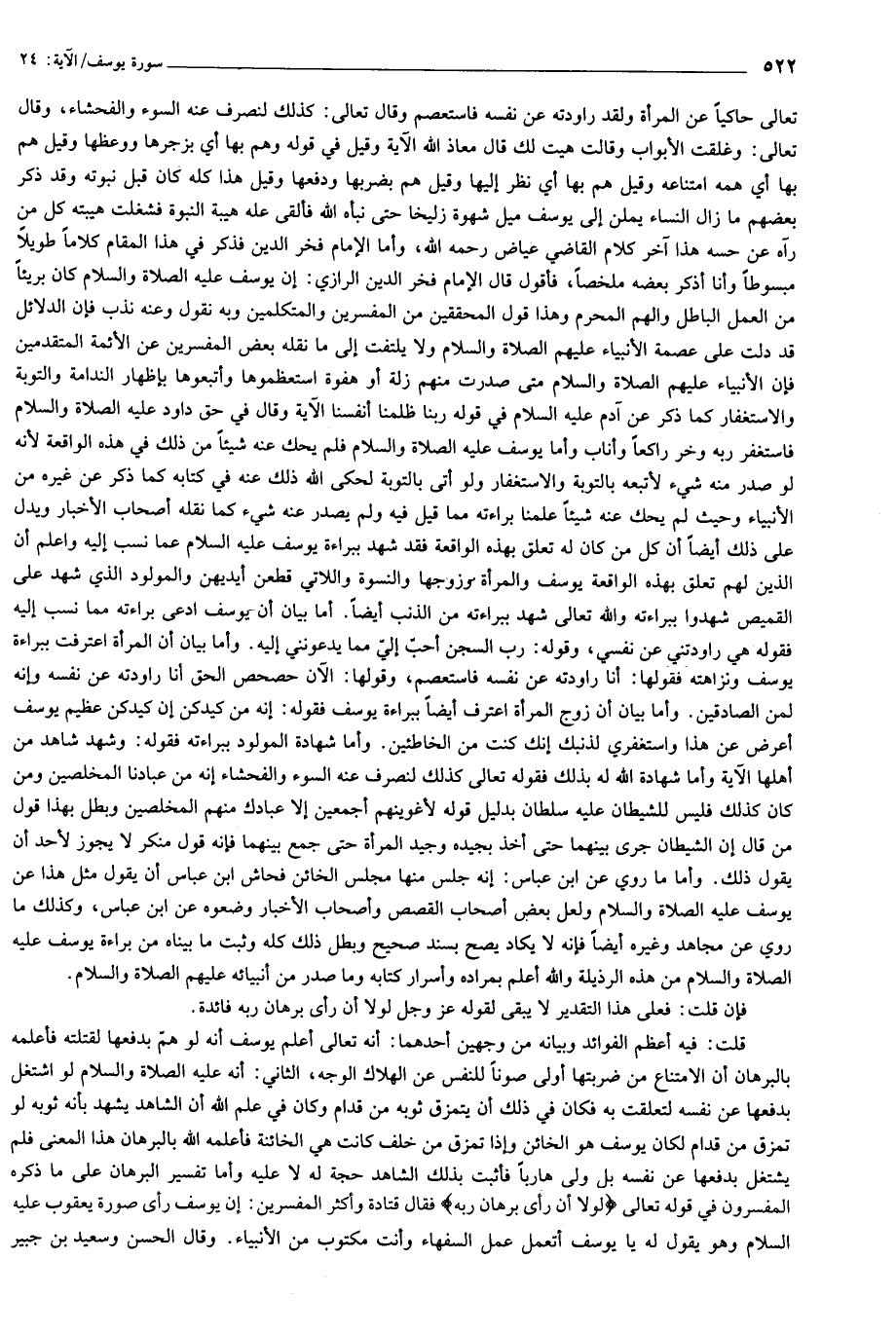 تعالى حاكيا عن المرأة ولقد راودته عن نفسه فاستعصم وقال تعالى: كذلك لنصرف عنه السوء والفحشاء، وقال تعالى: وغلقت الأبواب وقالت هيت لك قال معاذ الله الآية وقيل في قوله وهم بها أي بزجرها ووعظها وقيل هم بها أي همه امتناعه وقيل هم بها أي نظر إليها وقيل هم بضربها ودفعها وقيل هذا كله كان قبل نبوته وقد ذكر بعضهم ما زال النساء يملن إلى يوسف ميل شهوة زليخا حتى نبأه الله فألقى عله هيبة النبوة فشغلت هيبته كل من رآه عن حسه هذا آخر كلام القاضي عياض رحمه الله، وأما الإمام فخر الدين فذكر في هذا المقام كلاما طويلا مبسوطا وأنا أذكر بعضه ملخصا، فأقول قال الإمام فخر الدين الرازي: إن يوسف عليه الصلاة والسلام كان بريئا من العمل الباطل والهم المحرم وهذا قول المحققين من المفسرين والمتكلمين وبه نقول وعنه نذب فإن الدلائل قد دلت على عصمة الأنبياء عليهم الصلاة والسلام ولا يلتفت إلى ما نقله بعض المفسرين عن الأئمة المتقدمين فإن الأنبياء عليهم الصلاة والسلام متى صدرت منهم زلة أو هفوة استعظموها وأتبعوها بإظهار الندامة والتوبة والاستغفار كما ذكر عن آدم عليه السلام في قوله ربنا ظلمنا أنفسنا الآية وقال في حق داود عليه الصلاة والسلام فاستغفر ربه وخر راكعا وأناب وأما يوسف عليه الصلاة والسلام فلم يحك عنه شيئا من ذلك في هذه الواقعة لأنه لو صدر منه شيء لأتبعه بالتوبة والاستغفار ولو أتى بالتوبة لحكى الله ذلك عنه في كتابه كما ذكر عن غيره من الأنبياء وحيث لم يحك عنه شيئا علمنا براءته مما قيل فيه ولم يصدر عنه شيء كما نقله أصحاب الأخبار ويدل على ذلك أيضا أن كل من كان له تعلق بهذه الواقعة فقد شهد ببراءة يوسف عليه السلام عما نسب إليه واعلم أن الذين لهم تعلق بهذه الواقعة يوسف والمرأة وزوجها والنسوة واللاتي قطعن أيديهن والمولود الذي شهد على القميص شهدوا ببراءته والله تعالى شهد ببراءته من الذنب أيضا. أما بيان أن يوسف ادعى براءته مما نسب إليه فقوله هي راودتني عن نفسي، وقوله: رب السجن أحبّ إليّ مما يدعونني إليه. وأما بيان أن المرأة اعترفت ببراءة يوسف ونزاهته فقولها: أنا راودته عن نفسه فاستعصم، وقولها: الآن حصحص الحق أنا راودته عن نفسه وإنه لمن الصادقين. وأما بيان أن زوج المرأة اعترف أيضا ببراءة يوسف فقوله: إنه من كيدكن إن كيدكن عظيم يوسف أعرض عن هذا واستغفري لذنبك إنك كنت من الخاطئين. وأما شهادة المولود ببراءته فقوله: وشهد شاهد من أهلها الآية وأما شهادة الله له بذلك فقوله تعالى كذلك لنصرف عنه السوء والفحشاء إنه من عبادنا المخلصين ومن كان كذلك فليس للشيطان عليه سلطان بدليل قوله