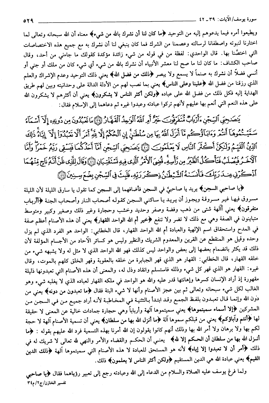 يا صاحِبَيِ السِّجْنِ يريد يا صاحبيّ في السجن فأضافهما إلى السجن كما تقول يا سارق الليلة لأن الليلة مسروق فيها غير مسروقة ويجوز أن يريد يا ساكني السجن كقوله أصحاب النار وأصحاب الجنة أَأَرْبابٌ مُتَفَرِّقُونَ يعني أآلهة شتى من ذهب وفضة وصفر وحديد وخشب وحجارة وغير ذلك وصغير وكبير ومتوسط متباينون في الصفة وهي مع ذلك لا تضر ولا تنفع خَيْرٌ أَمِ اللَّهُ الْواحِدُ الْقَهَّارُ يعني أن هذه الأصنام أعظم صفة في المدح واستحقاق اسم الإلهية والعبادة أم الله الواحد القهار، قال الخطابي: الواحد هو الفرد الذي لم يزل وحده وقيل هو المنقطع عن القرين والمعدوم الشريك والنظير وليس هو كسائر الآحاد من الأجسام المؤلفة لأن ذلك قد يكثر بانضمام بعضها إلى بعض والواحد ليس كذلك فهو الله الواحد الذي لا مثل له ولا يشبهه شيء من خلقه القهار، قال الخطابي: القهار هو الذي قهر الجبابرة من خلقه بالعقوبة وقهر الخلق كلهم بالموت، وقال غيره: القهار هو الذي قهر كل شيء وذلله فاستسلم وانقاد وذل له، والمعنى أن هذه الأصنام التي تعبدونها ذليلة مقهورة إذ أراد الإنسان كسرها وإهانتها قدر عليه والله هو الواحد في ملكه القهار لعباده الذي لا يغلبه شيء وهو الغالب لكل شيء سبحانه وتعالى ثم بين عجز الأصنام وأنها لا شيء البتة فقال ما تَعْبُدُونَ مِنْ دُونِهِ يعني من دون الله وإنما قال تعبدون بلفظ الجمع وقد ابتدأ بالتثنية في المخاطبة لأنه أراد جميع من في السجن من المشركين إِلَّا أَسْماءً سَمَّيْتُمُوها يعني سميتموها آلهة وأربابا وهي حجارة جمادات خالية عن المعنى لا حقيقة لها أَنْتُمْ وَآباؤُكُمْ يعني من قبلكم سموها آلة ما أَنْزَلَ اللَّهُ بِها مِنْ سُلْطانٍ يعني أن تسمية الأصنام آلهة لا حجة لكم بها ولا برهان ولا أمر الله بها وذلك أنهم كانوا يقولون إن الله أمرنا بهذه التسمية فرد الله عليهم بقوله: ما أَنْزَلَ اللَّهُ بِها مِنْ سُلْطانٍ إِنِ الْحُكْمُ إِلَّا لِلَّهِ يعني أن الحكم والقضاء والأمر والنهي لله تعالى لا شريك له في ذلك أَمَرَ أَلَّا تَعْبُدُوا إِلَّا إِيَّاهُ لأنه هو المستحق للعبادة لا هذه الأصنام التي سميتموها آلهة ذلِكَ الدِّينُ الْقَيِّمُ يعني عبادة الله هي الدين المستقيم وَلكِنَّ أَكْثَرَ النَّاسِ لا يَعْلَمُونَ ذلك.
