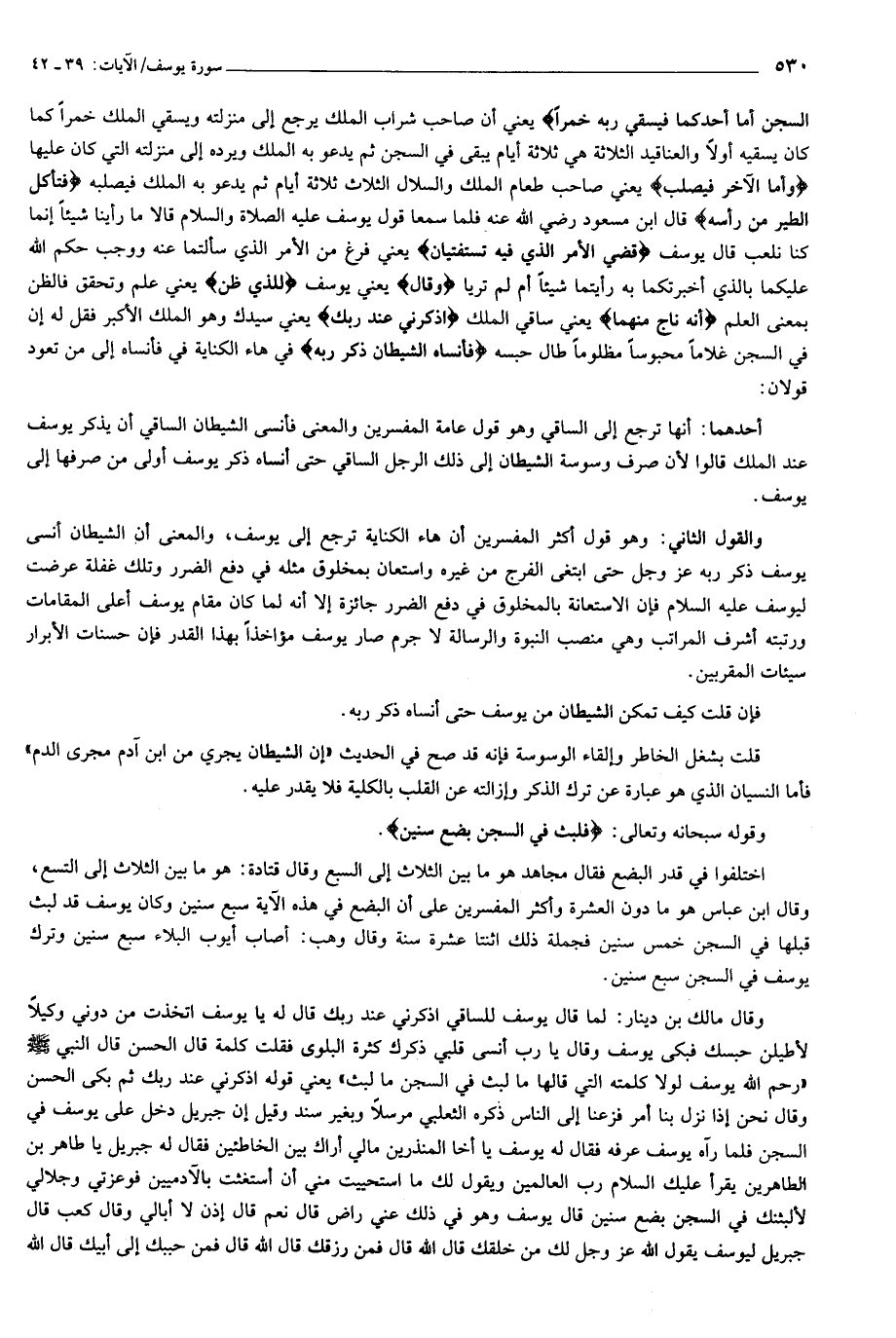 والقول الثاني: وهو قول أكثر المفسرين أن هاء الكناية ترجع إلى يوسف، والمعنى أن الشيطان أنسى يوسف ذكر ربه عز وجل حتى ابتغى الفرج من غيره واستعان بمخلوق مثله في دفع الضرر وتلك غفلة عرضت ليوسف عليه السلام فإن الاستعانة بالمخلوق في دفع الضرر جائزة إلا أنه لما كان مقام يوسف أعلى المقامات ورتبته أشرف المراتب وهي منصب النبوة والرسالة لا جرم صار يوسف مؤاخذا بهذا القدر فإن حسنات الأبرار سيئات المقربين.