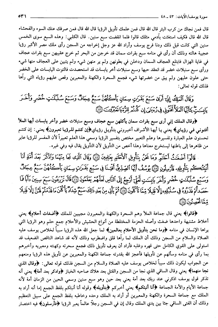 قالُوا أَضْغاثُ أَحْلامٍ وَما نَحْنُ بِتَأْوِيلِ الْأَحْلامِ بِعالِمِينَ (44) وَقالَ الَّذِي نَجا مِنْهُما وَادَّكَرَ بَعْدَ أُمَّةٍ أَنَا أُنَبِّئُكُمْ بِتَأْوِيلِهِ فَأَرْسِلُونِ (45) يُوسُفُ أَيُّهَا الصِّدِّيقُ أَفْتِنا فِي سَبْعِ بَقَراتٍ سِمانٍ يَأْكُلُهُنَّ سَبْعٌ عِجافٌ وَسَبْعِ سُنْبُلاتٍ خُضْرٍ وَأُخَرَ يابِساتٍ لَعَلِّي أَرْجِعُ إِلَى النَّاسِ لَعَلَّهُمْ يَعْلَمُونَ (46) قالَ تَزْرَعُونَ سَبْعَ سِنِينَ دَأَباً فَما حَصَدْتُمْ فَذَرُوهُ فِي سُنْبُلِهِ إِلاَّ قَلِيلاً مِمَّا تَأْكُلُونَ (47) ثُمَّ يَأْتِي مِنْ بَعْدِ ذلِكَ سَبْعٌ شِدادٌ يَأْكُلْنَ ما قَدَّمْتُمْ لَهُنَّ إِلاَّ قَلِيلاً مِمَّا تُحْصِنُونَ (48)