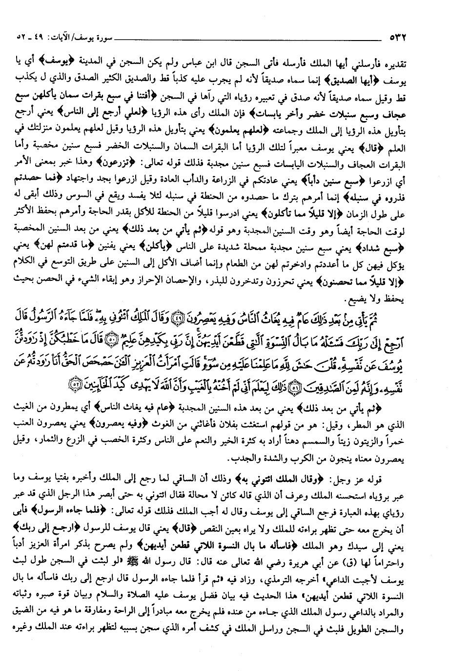 ثُمَّ يَأْتِي مِنْ بَعْدِ ذلِكَ عامٌ فِيهِ يُغاثُ النَّاسُ وَفِيهِ يَعْصِرُونَ (49) وَقالَ الْمَلِكُ ائْتُونِي بِهِ فَلَمَّا جاءَهُ الرَّسُولُ قالَ ارْجِعْ إِلى رَبِّكَ فَسْئَلْهُ ما بالُ النِّسْوَةِ اللاَّتِي قَطَّعْنَ أَيْدِيَهُنَّ إِنَّ رَبِّي بِكَيْدِهِنَّ عَلِيمٌ (50) قالَ ما خَطْبُكُنَّ إِذْ راوَدْتُنَّ يُوسُفَ عَنْ نَفْسِهِ قُلْنَ حاشَ لِلَّهِ ما عَلِمْنا عَلَيْهِ مِنْ سُوءٍ قالَتِ امْرَأَةُ الْعَزِيزِ الْآنَ حَصْحَصَ الْحَقُّ أَنَا راوَدْتُهُ عَنْ نَفْسِهِ وَإِنَّهُ لَمِنَ الصَّادِقِينَ (51) ذلِكَ لِيَعْلَمَ أَنِّي لَمْ أَخُنْهُ بِالْغَيْبِ وَأَنَّ اللَّهَ لا يَهْدِي كَيْدَ الْخائِنِينَ (52)