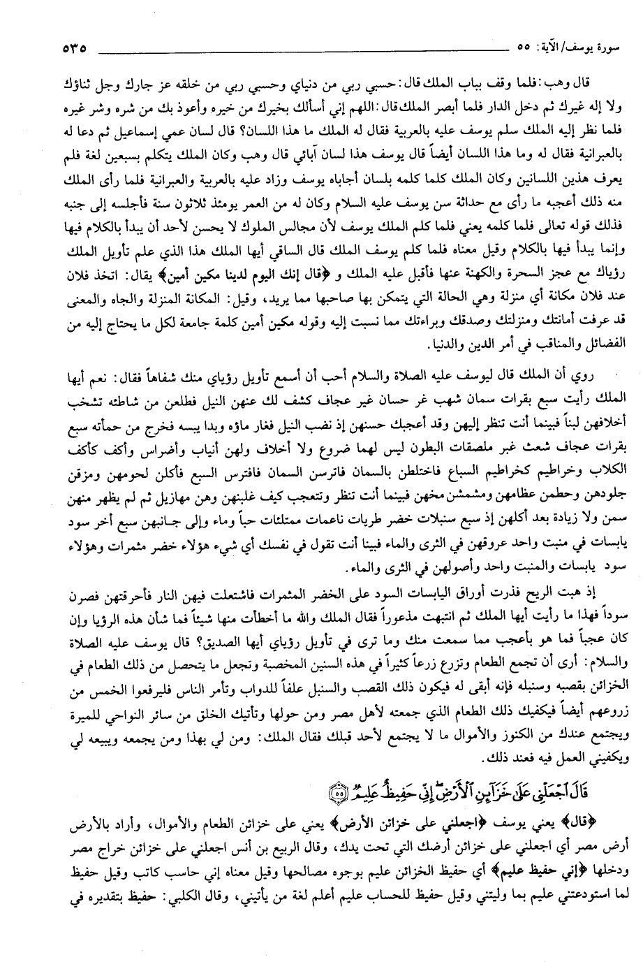 قالَ يعني يوسف اجْعَلْنِي عَلى خَزائِنِ الْأَرْضِ يعني على خزائن الطعام والأموال، وأراد بالأرض أرض مصر أي اجعلني على خزائن أرضك التي تحت يدك، وقال الربيع بن أنس اجعلني على خزائن خراج مصر ودخلها إِنِّي حَفِيظٌ عَلِيمٌ أي حفيظ الخزائن عليم بوجوه مصالحها وقيل معناه إني حاسب كاتب وقيل حفيظ لما استودعتني عليم بما وليتني وقيل حفيظ للحساب عليم أعلم لغة من يأتيني، وقال الكلبي: حفيظ بتقديره في