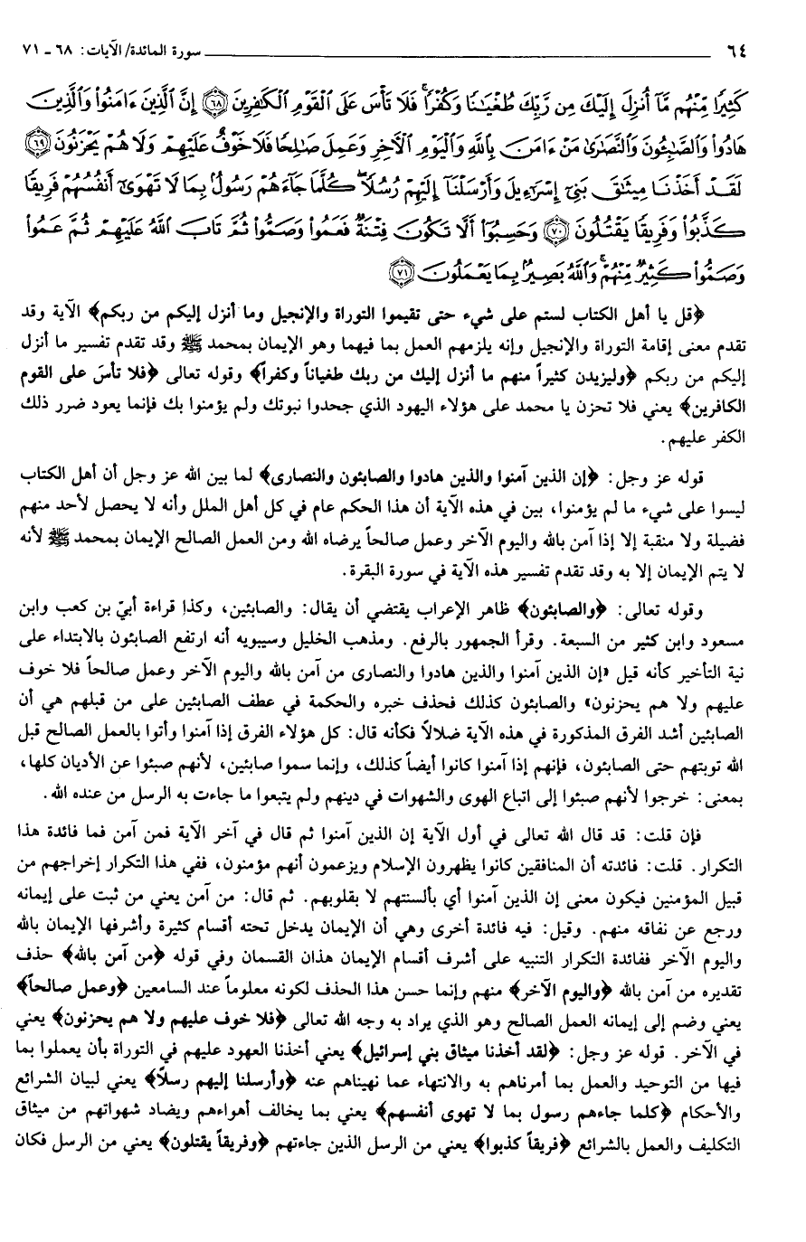 قُلْ يا أَهْلَ الْكِتابِ لَسْتُمْ عَلى شَيْءٍ حَتَّى تُقِيمُوا التَّوْراةَ وَالْإِنْجِيلَ وَما أُنْزِلَ إِلَيْكُمْ مِنْ رَبِّكُمْ وَلَيَزِيدَنَّ كَثِيراً مِنْهُمْ ما أُنْزِلَ إِلَيْكَ مِنْ رَبِّكَ طُغْياناً وَكُفْراً فَلا تَأْسَ عَلَى الْقَوْمِ الْكافِرِينَ (68) إِنَّ الَّذِينَ آمَنُوا وَالَّذِينَ هادُوا وَالصَّابِئُونَ وَالنَّصارى مَنْ آمَنَ بِاللَّهِ وَالْيَوْمِ الْآخِرِ وَعَمِلَ صالِحاً فَلا خَوْفٌ عَلَيْهِمْ وَلا هُمْ يَحْزَنُونَ (69) لَقَدْ أَخَذْنا مِيثاقَ بَنِي إِسْرائِيلَ وَأَرْسَلْنا إِلَيْهِمْ رُسُلاً كُلَّما جاءَهُمْ رَسُولٌ بِما لا تَهْوى أَنْفُسُهُمْ فَرِيقاً كَذَّبُوا وَفَرِيقاً يَقْتُلُونَ (70) وَحَسِبُوا أَلاَّ تَكُونَ فِتْنَةٌ فَعَمُوا وَصَمُّوا ثُمَّ تابَ اللَّهُ عَلَيْهِمْ ثُمَّ عَمُوا وَصَمُّوا كَثِيرٌ مِنْهُمْ وَاللَّهُ بَصِيرٌ بِما يَعْمَلُونَ (71)